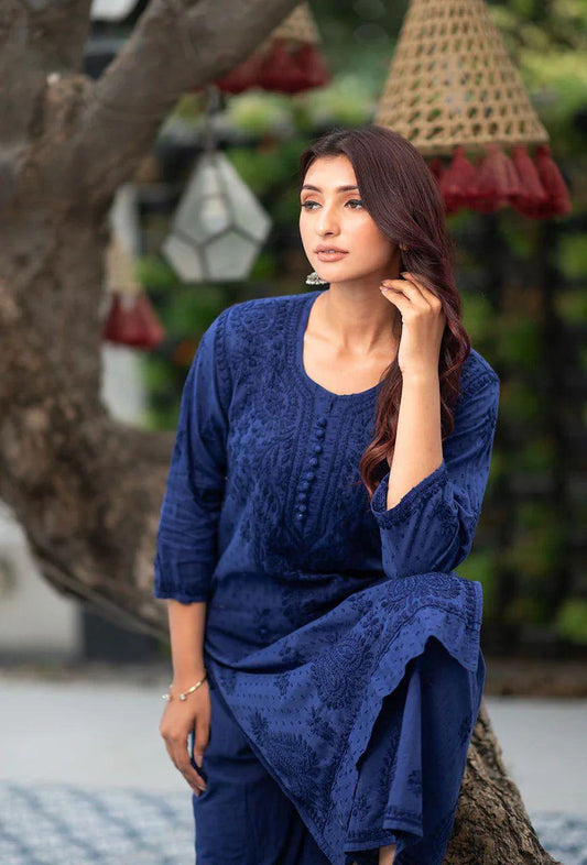 Dark Blue Exclusive Lucknow Chikankari Cotton Kurti & Pant Co-ord Set