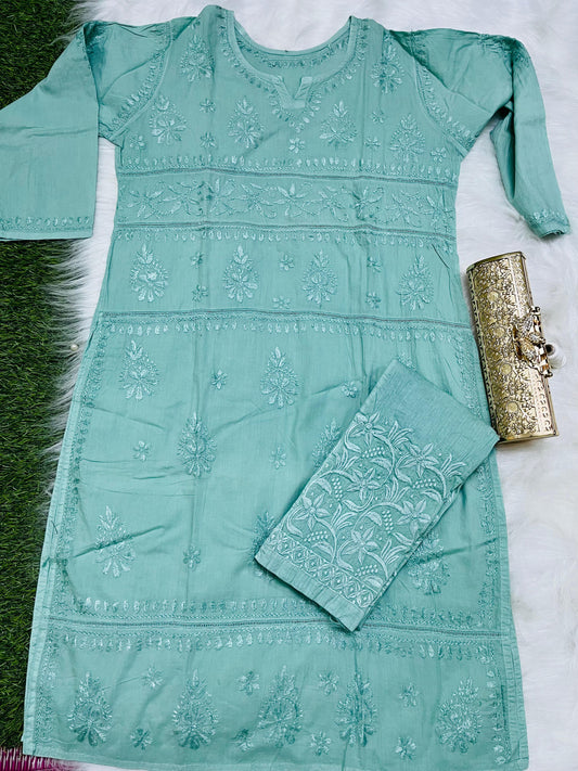Pastel Green New Designer Lace Pattern Kurti Set in Cotton Chikankari Handwork