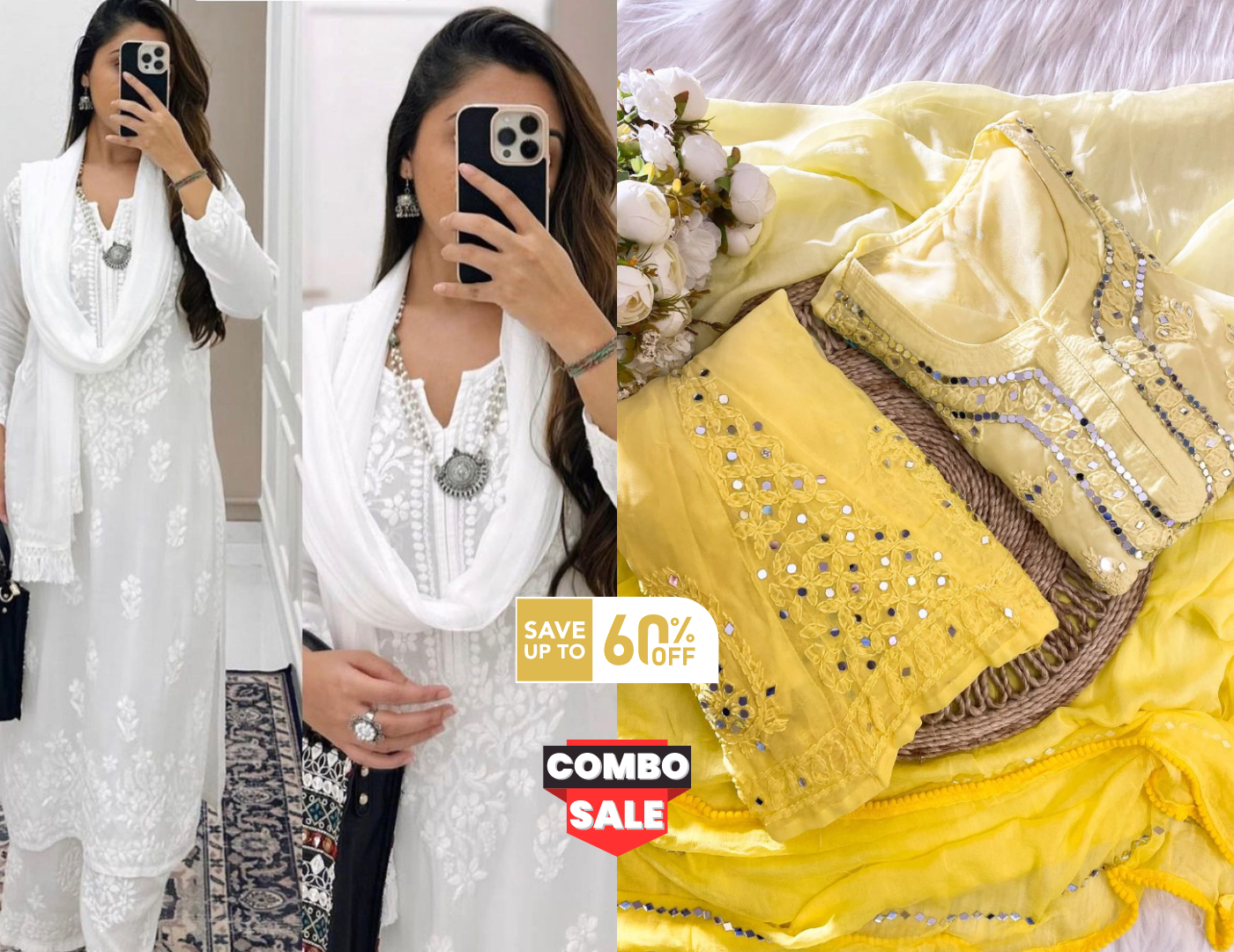 Set of 2 Combo Yellow Chikankari Ombré Mirror Set & White Chikankari Modal 3 Pc Set