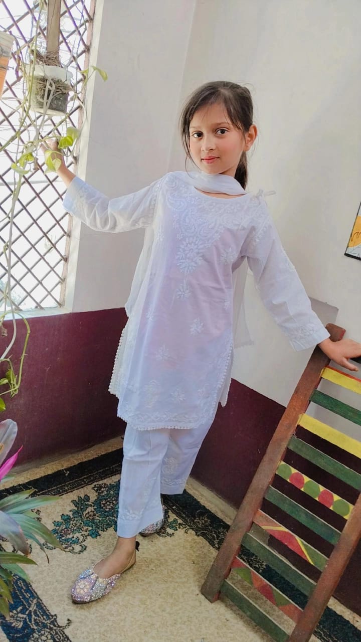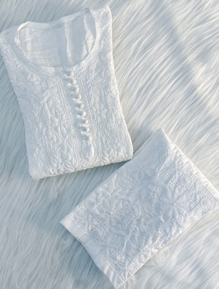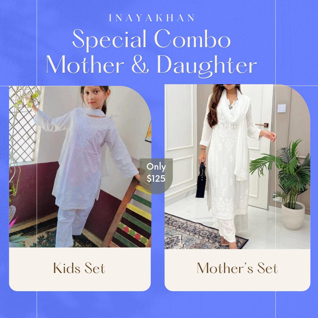 Combo Mother Daughter White Lucknow Chikankari Kurta Pant and Dupatta Set