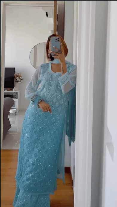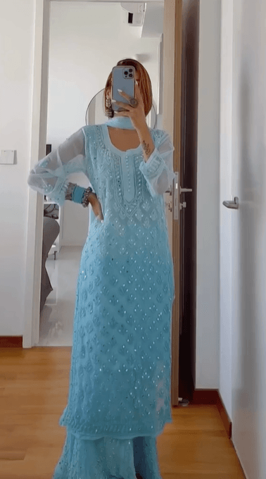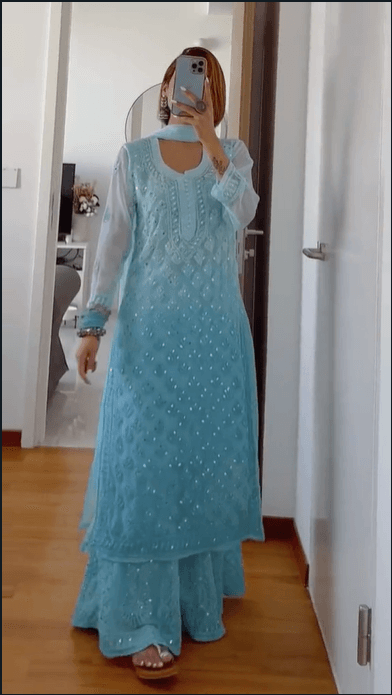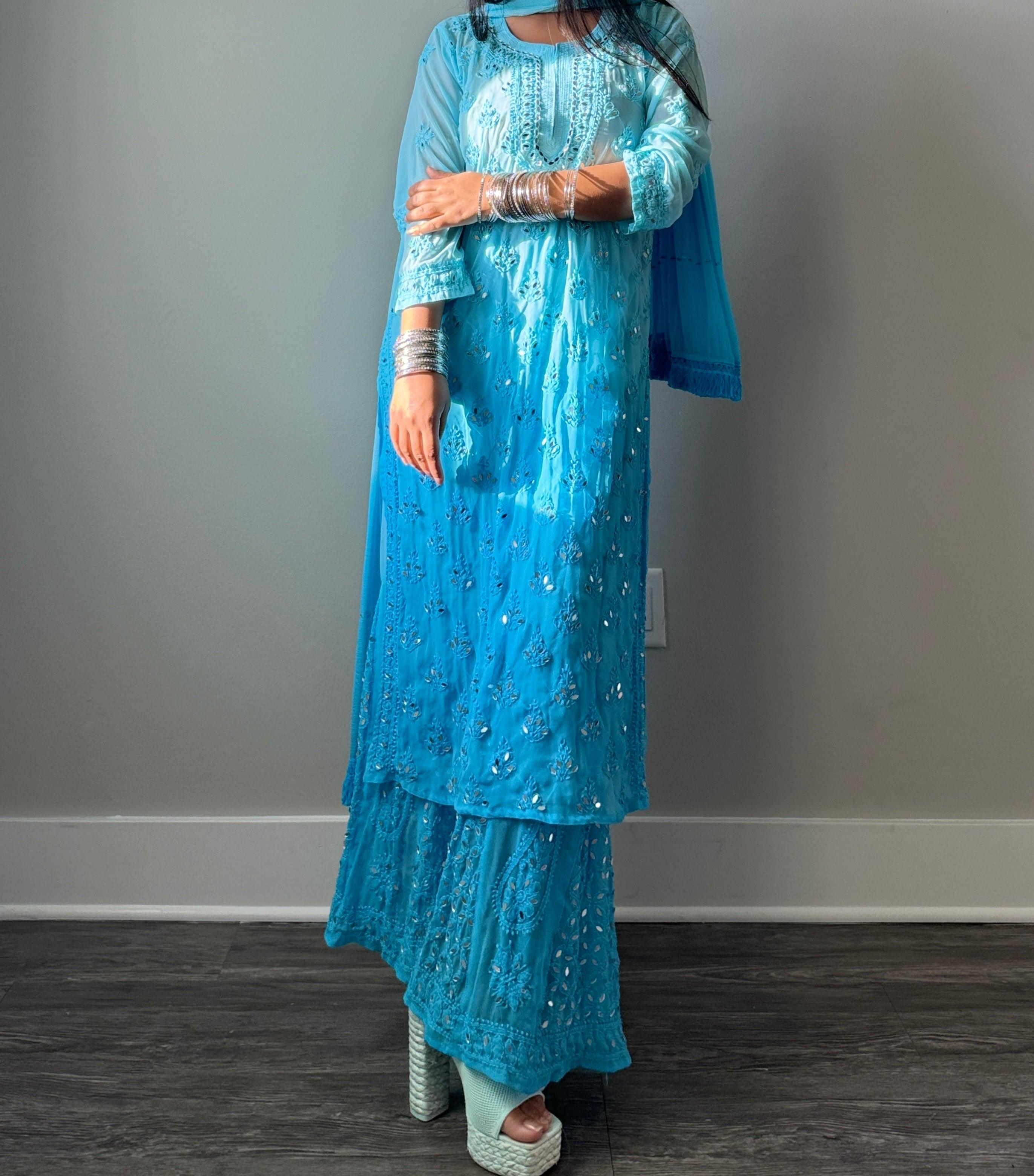 Combo Sets Aqua Blue Mirror Set and White Ethereal Modal Chikankari Kurta 3 pc Set