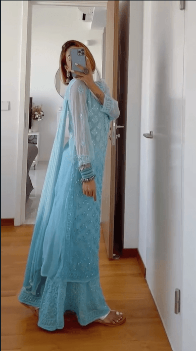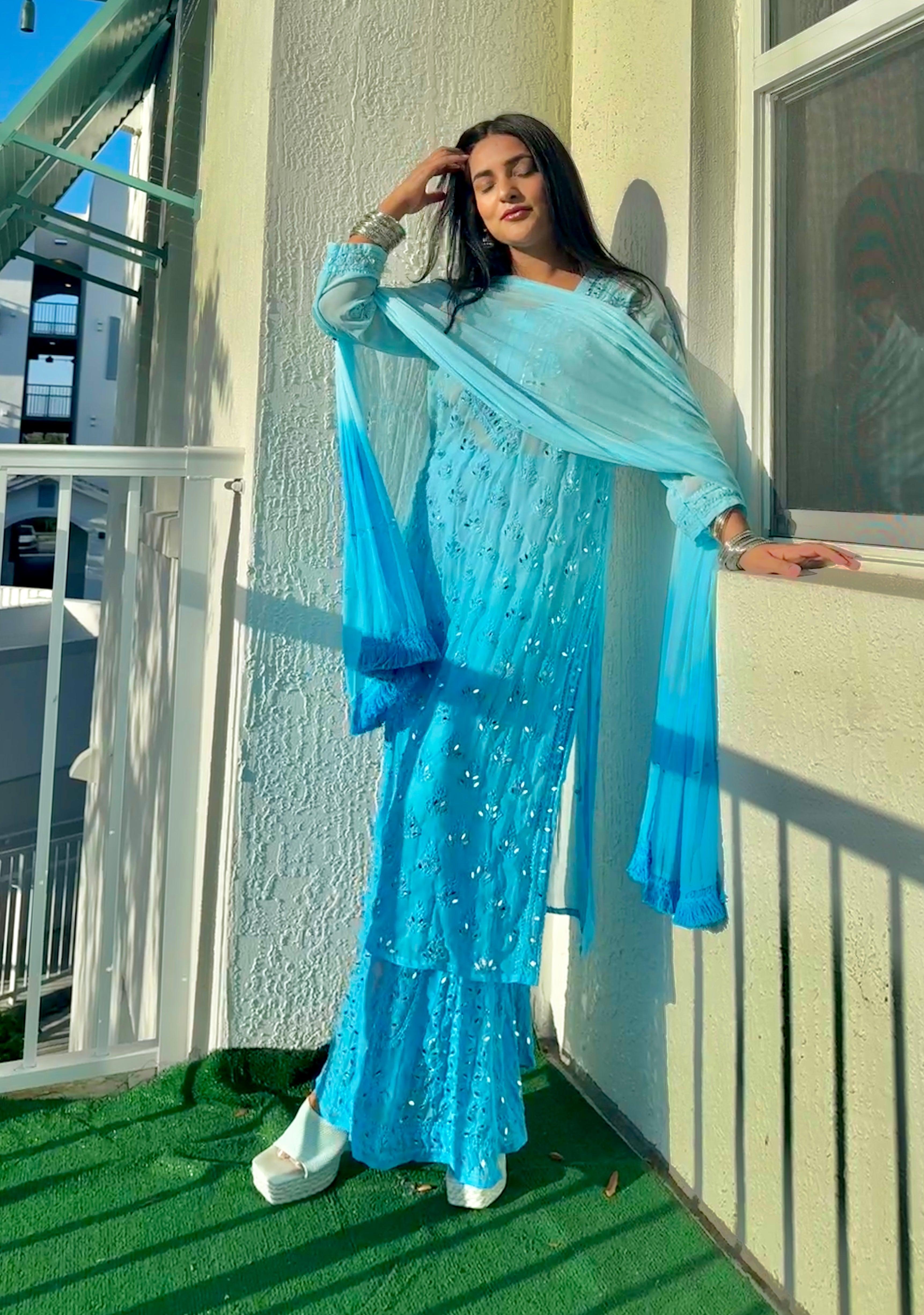 Buy 1 Get 1 Combo. Price Chikankari Elegance Ombré Mirror Booti Jaal Set (Aqua Blue / White)