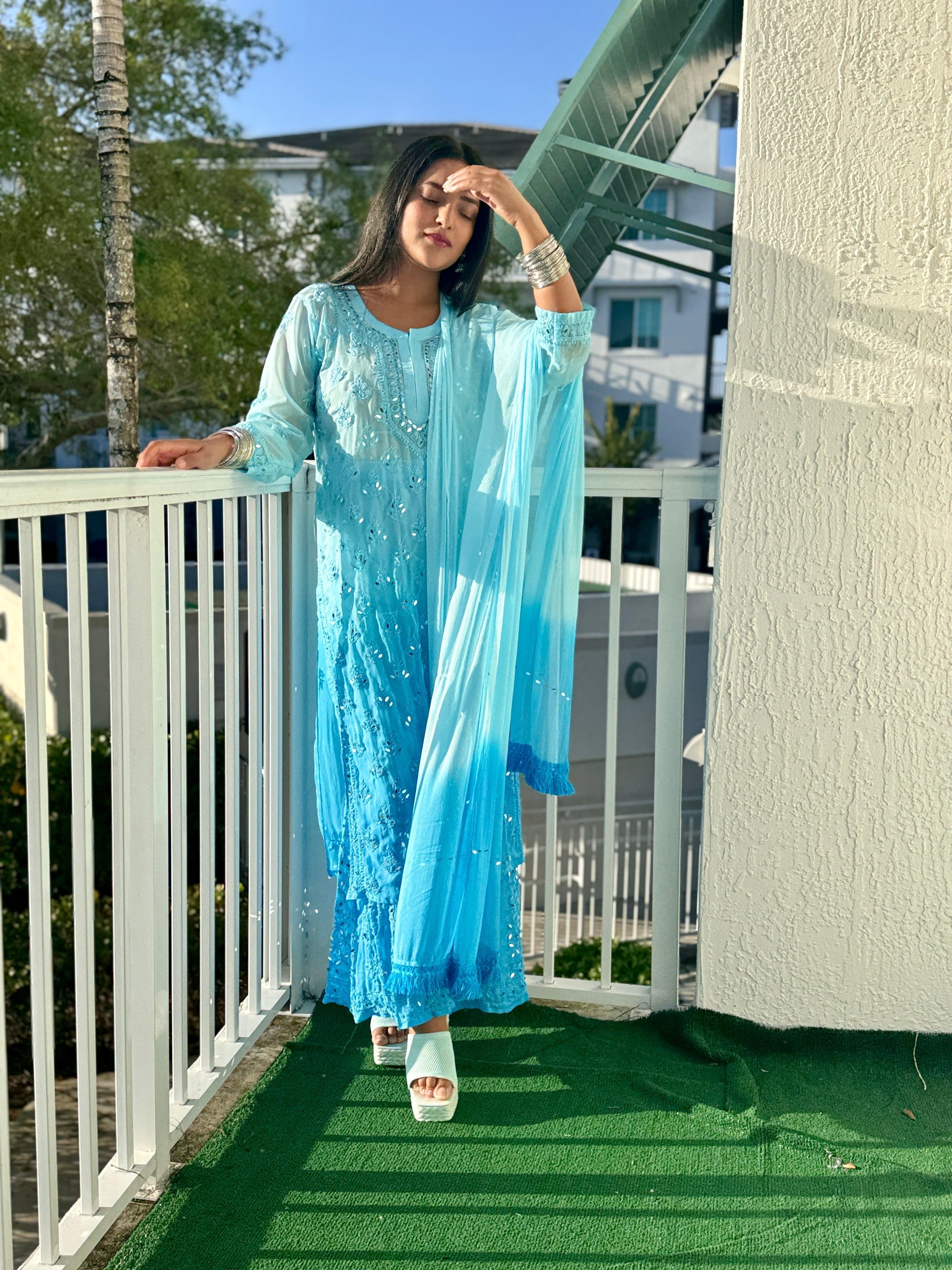 Buy 1 Get 1 Combo Price Chikankari Elegance Ombré Mirror Booti Jaal Set (Aqua Blue / Light Blue)