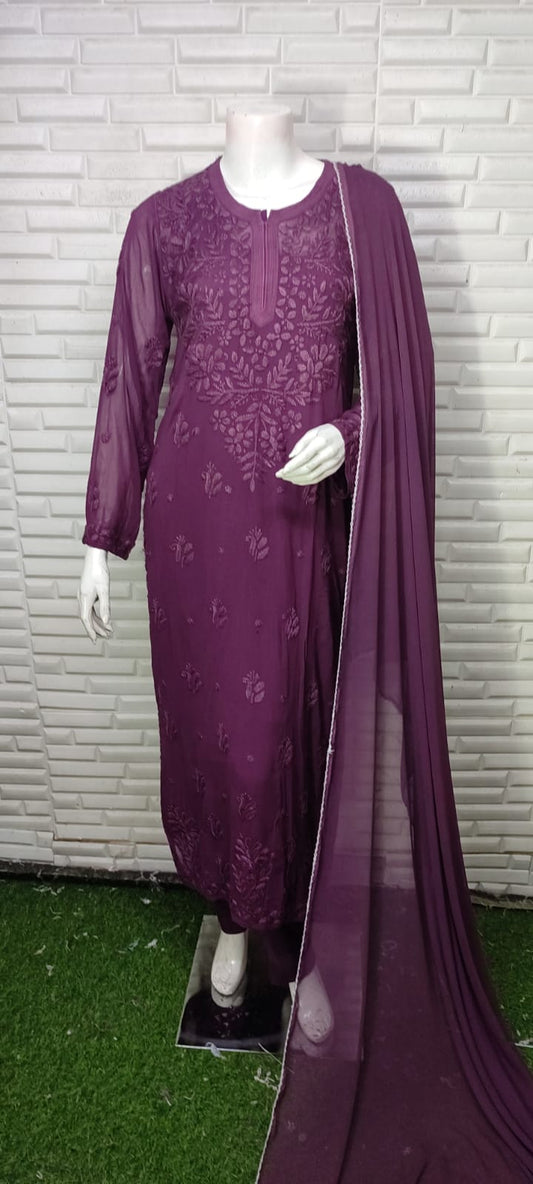 Purple Luxe Viscose Ring Work Jaal Lucknow Chikankari Kurti and Pant Set with Dupatta