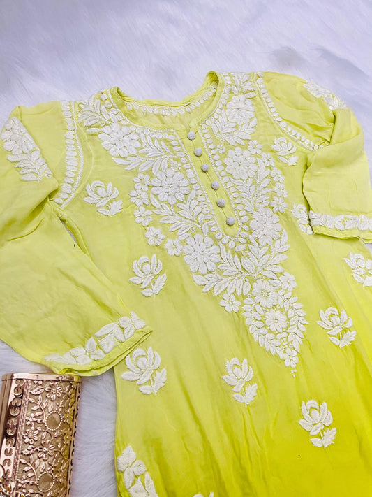 Yellow Handcrafted Resham Kurashiya Kurti & Lycra Chikankari Pants Set