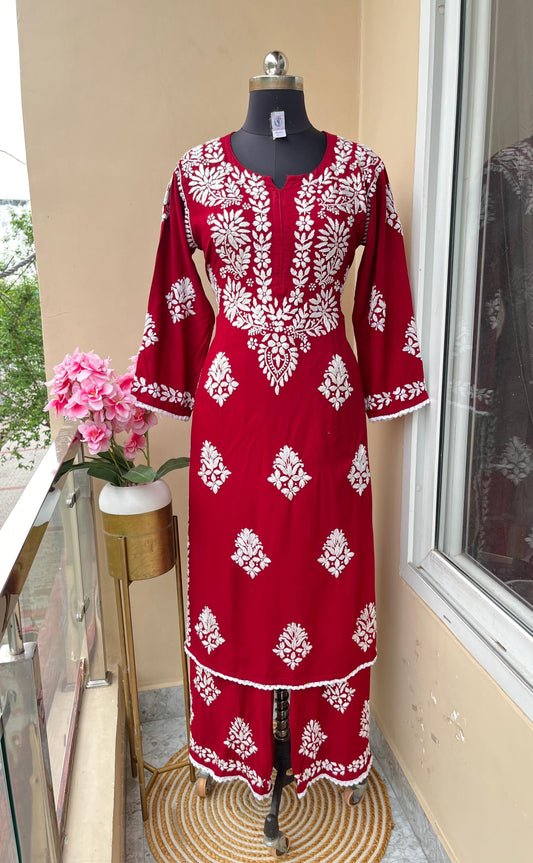 Maroon Premium Rayon Lucknow Chikankari Kurti and Pallazo Set