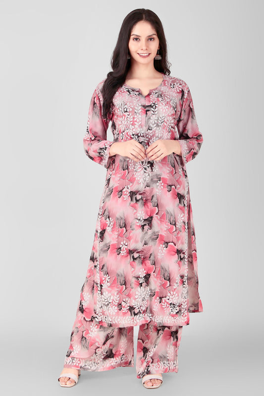 Pink Floral Printed Lucknow Chikankari Pallazo Set