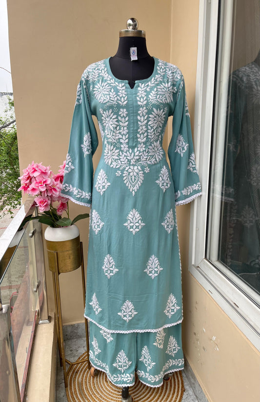 Teal Premium Rayon Lucknow Chikankari Kurti and Pallazo Set