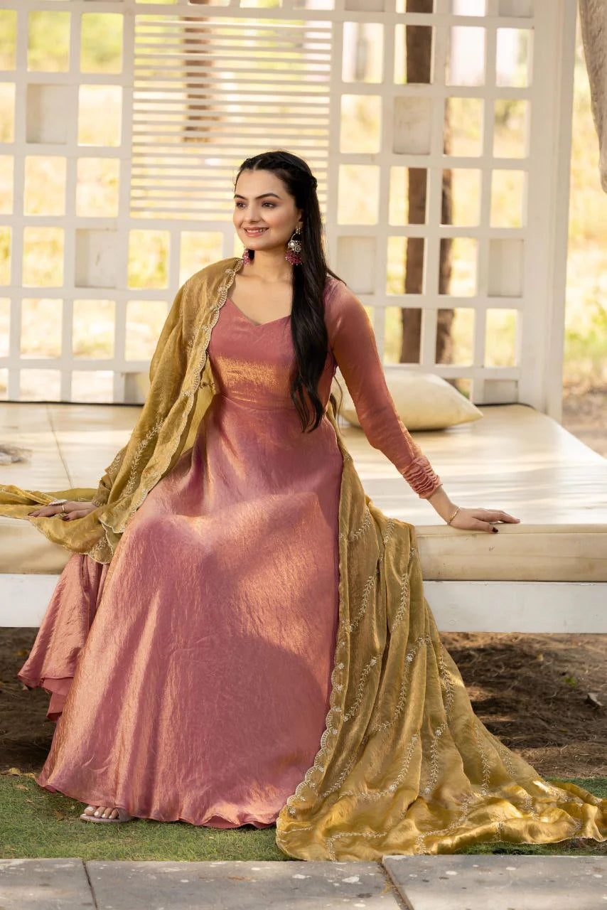 Peach Luxurious Plus Size Silk Party Gown with Dupatta (Up to 4XL/48) - Readymade