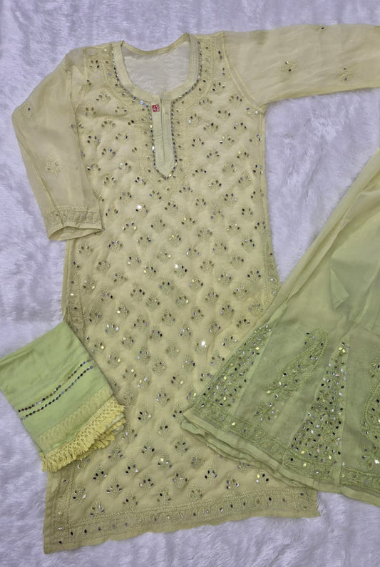 Light Green Lucknow Chikankari Mirror Sharara Kurti Set Elegant 4 Piece Outfit Inner Included