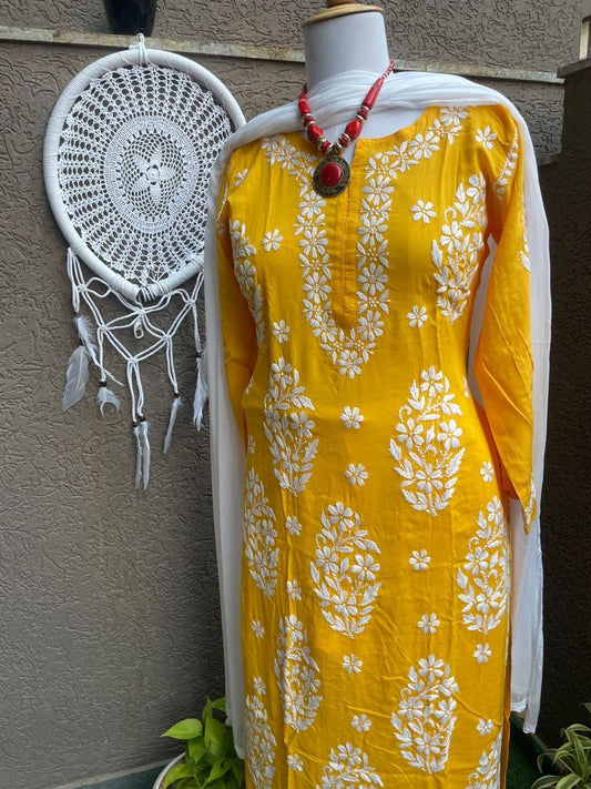 Yellow Chikankari Modal Fabric Kurti, Sharara, and Dupatta Set Bada Boota Kurti