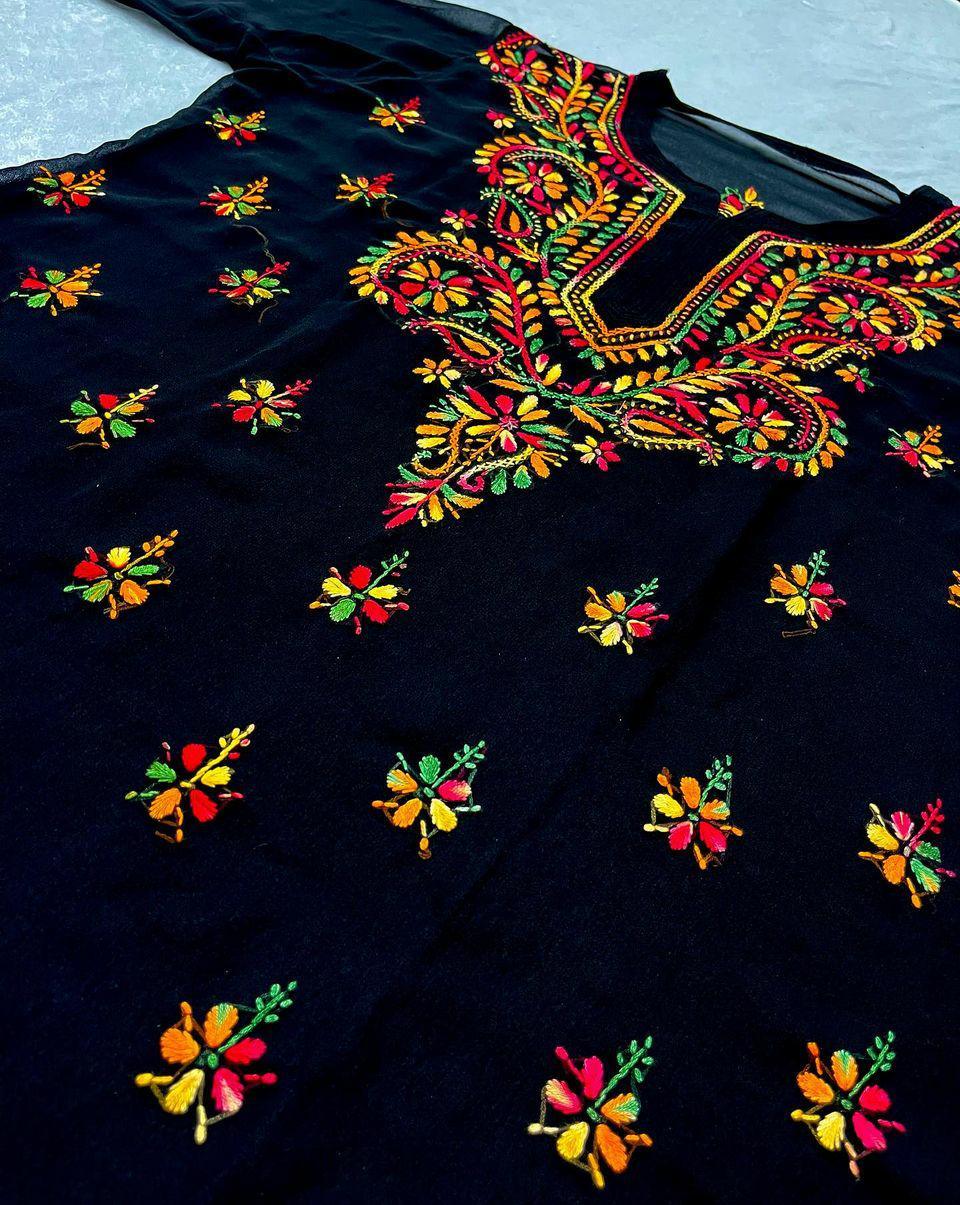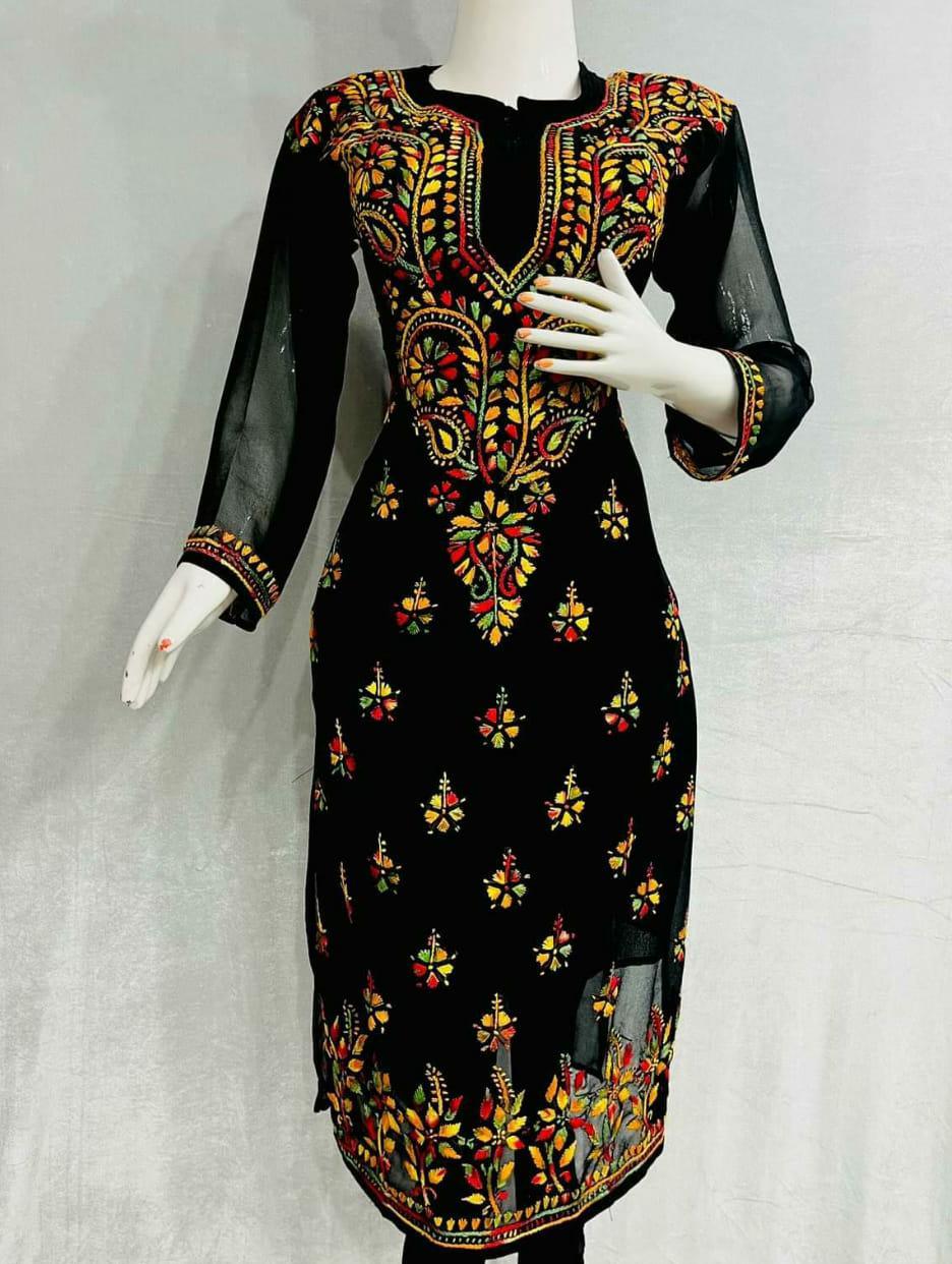 Step into a world of timeless elegance with our π€π Elegance in Diversity Georgette Chikankari Long Kurti ππ€. This exquisite black multicolor kurti is a celebration of craftsmanship and style.