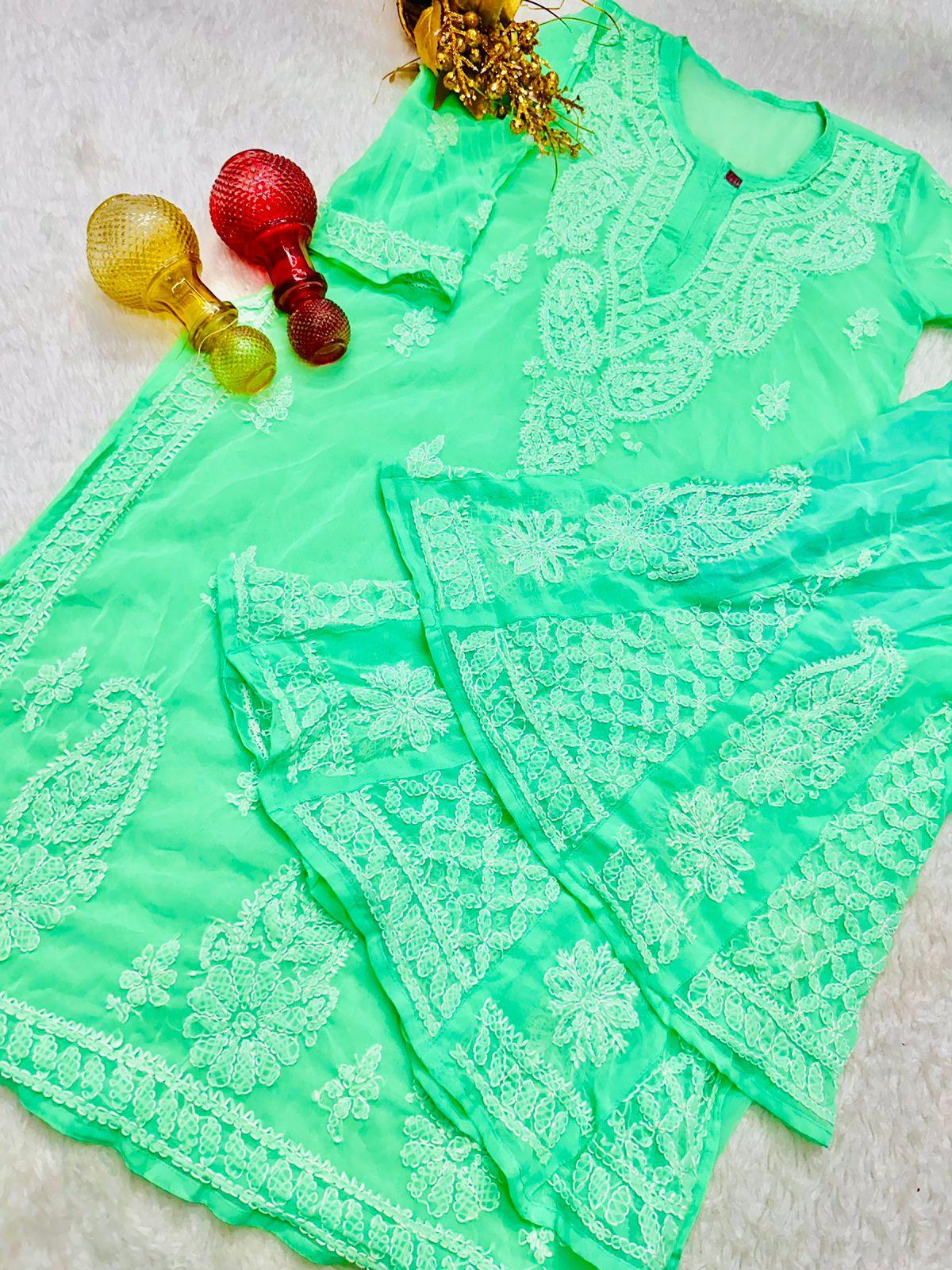 Aqua Green Lucknawi Chikankari Georgette Kurti and Sharara Set , Dupatta and Inner Included
