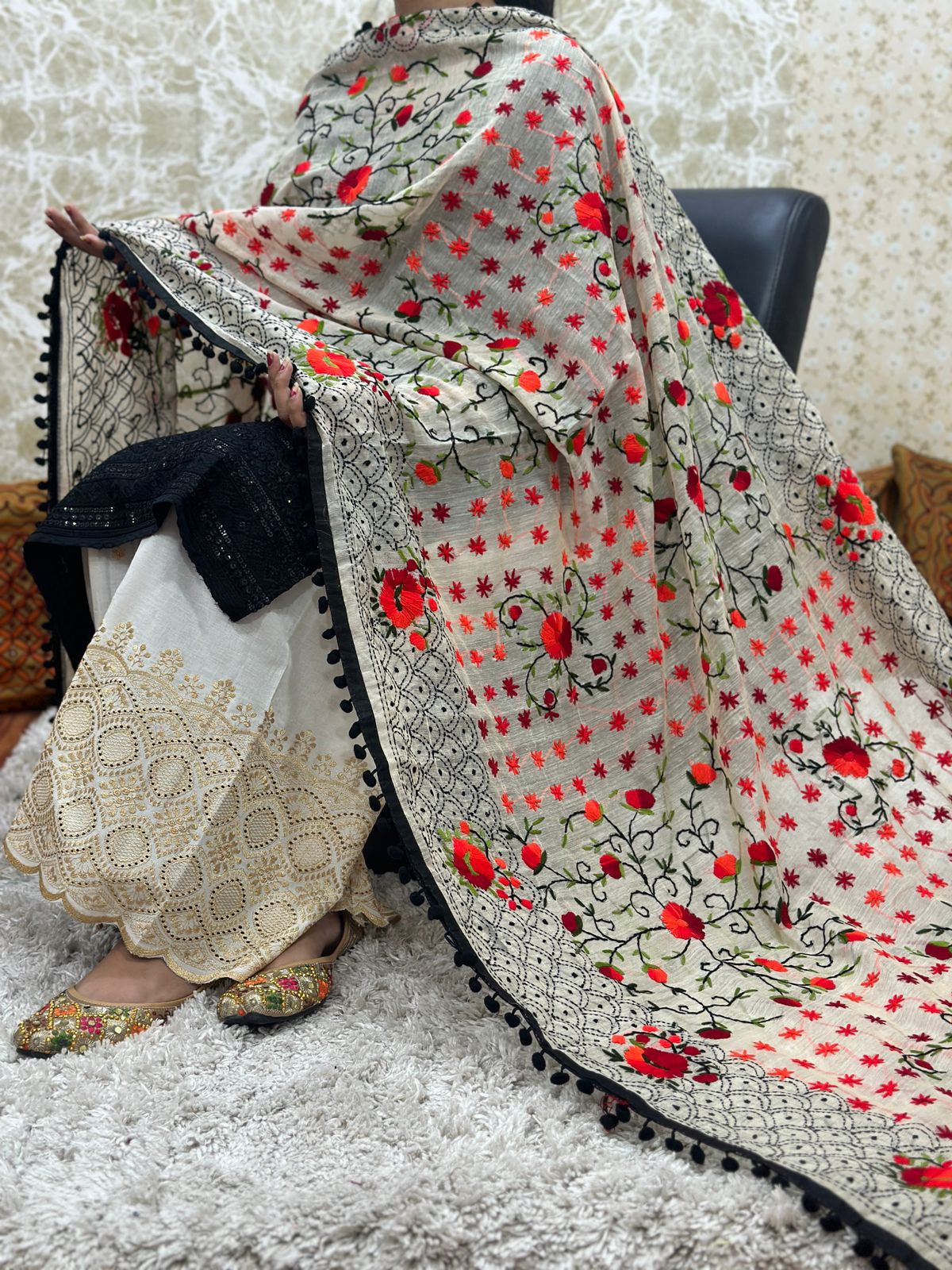 Step up your ethnic wear game with our elegant Pom Pom Dupatta Set, featuring a stunning Chikan Kurti with Sequin Work paired with a luxurious Zari Mastani Sharara and a handcrafted Pom Pom Dupatta on raw silk. This unique ensemble combines traditional embroidery with modern flair, making it perfect for festive occasions and special events.