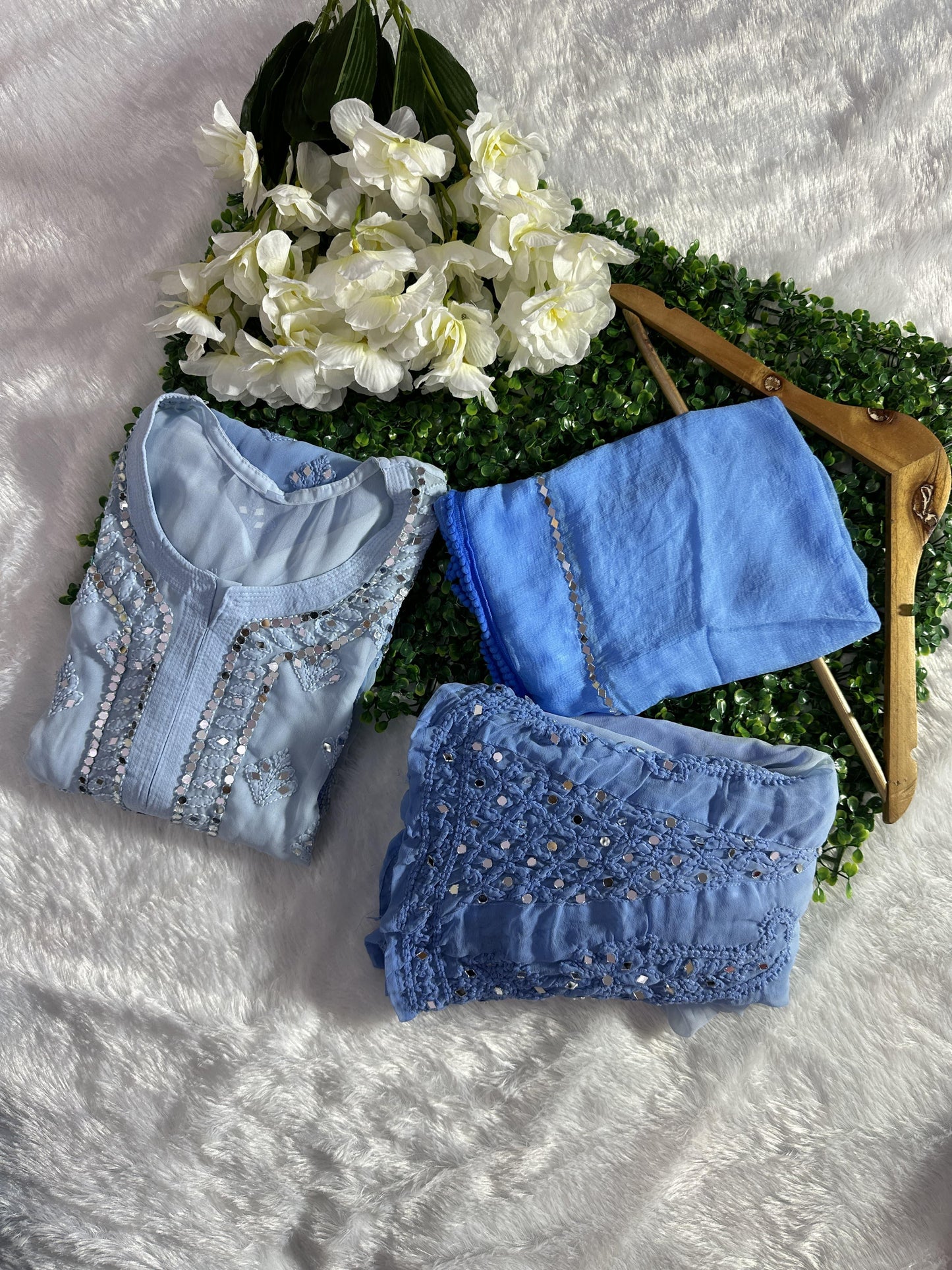 Blue Best Seller Georgette Mirror Gala Booti Chikankari Set with Beautiful Handwork Embroidery