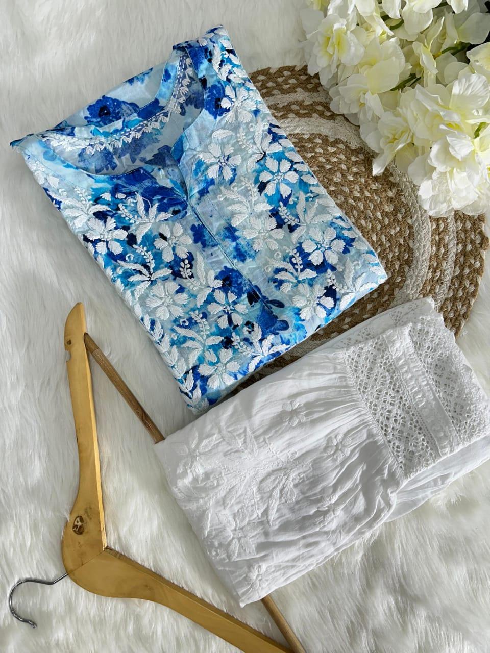 Blue Mixed color Mul Mul Daman Elegance: Hand-Embroidered Kurta & Afghani Pant Set