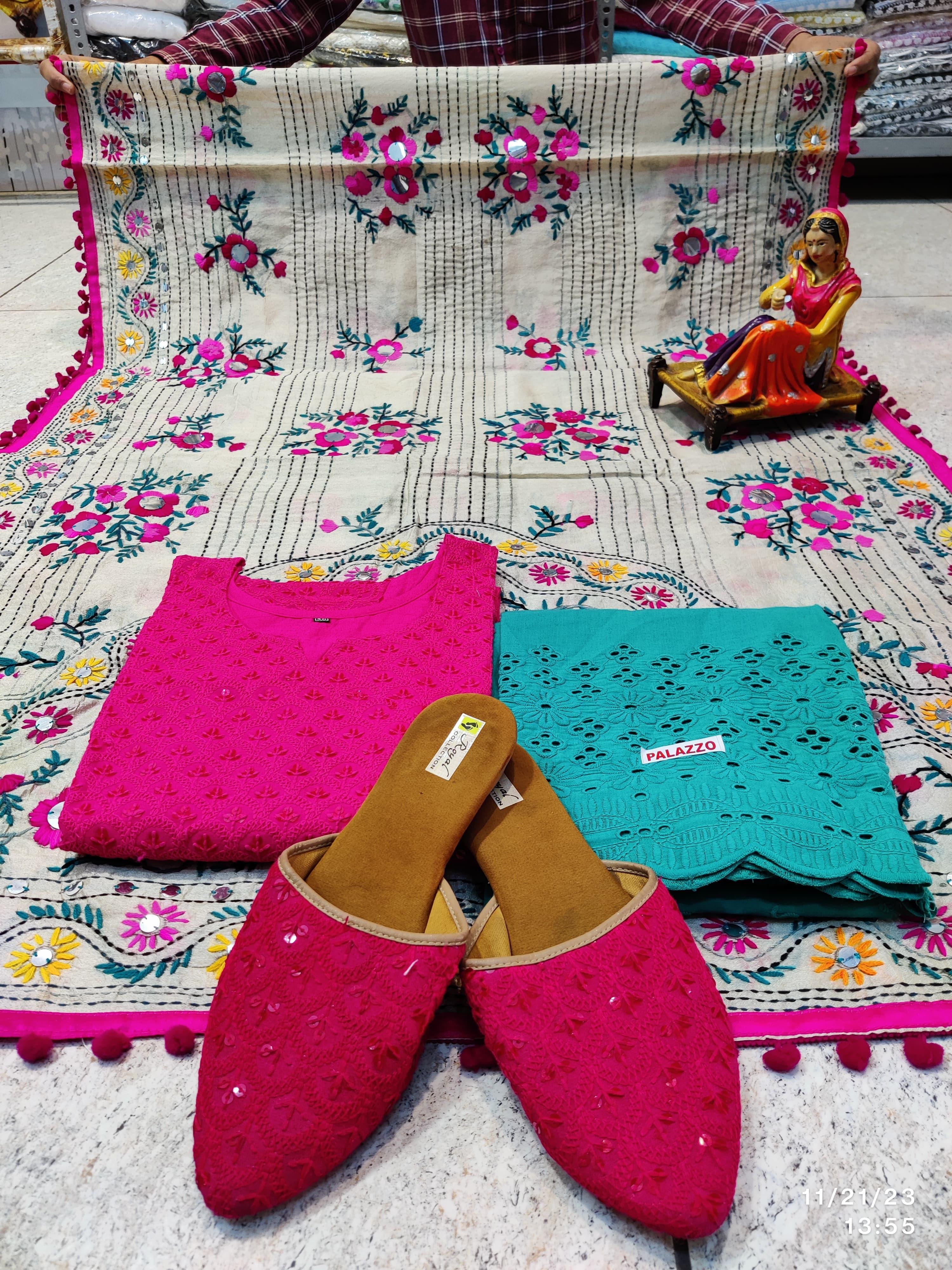 Complementing the kurti is a pair of pure cotton Chikankari palazzos, adorned with elegant sequin work. These palazzos offer a free fit up to a 44-inch waist, combining comfort with style. Their flowy silhouette and exquisite detailing create a balanced look that is both sophisticated and relaxed.