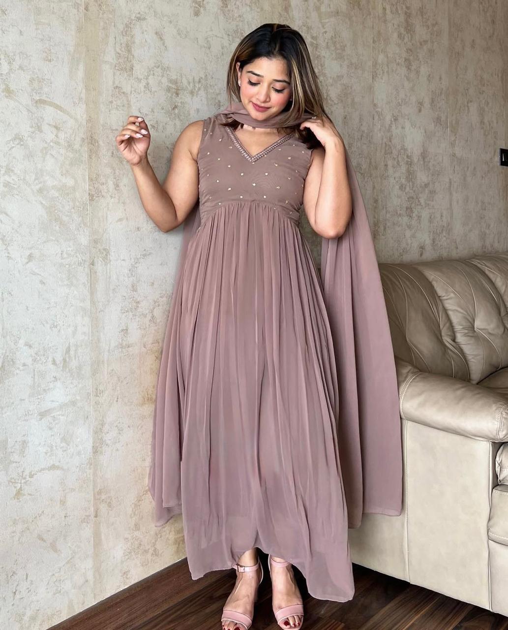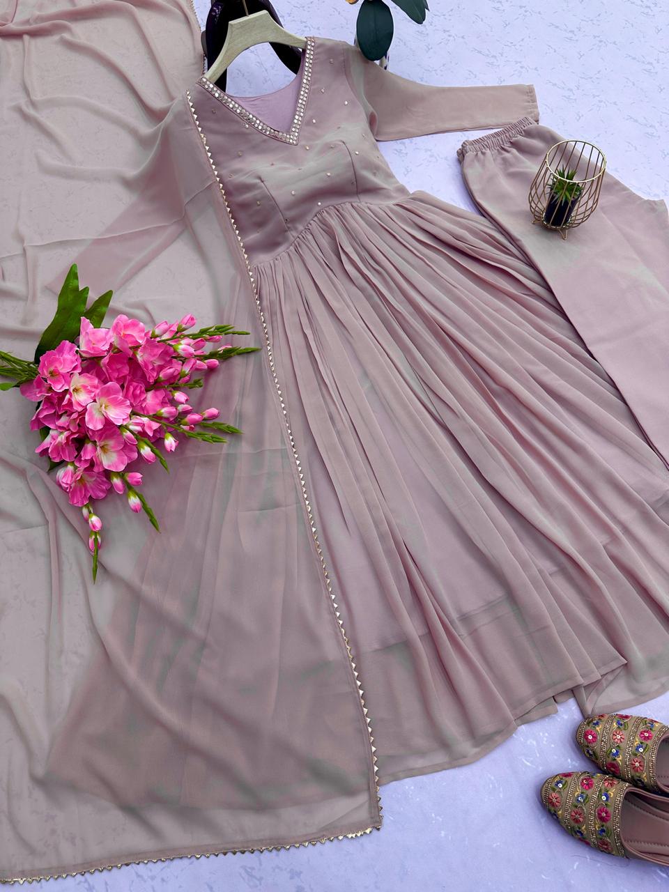 Light Mauve Sequin Embroidered Georgette Party Wear Gown Set with Pant & Dupatta