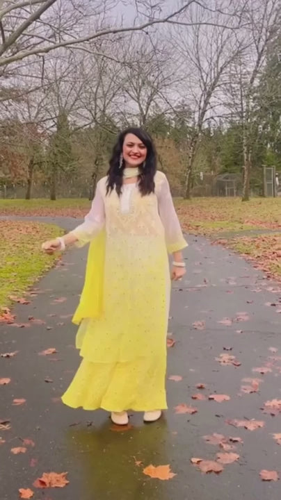 The set includes a beautiful Kurti, a matching Sharara, and a complementary Dupatta, all adorned with a delicate Mirror Booti Jaal design. The ombré effect on the georgette fabric adds a modern twist to the classic Chikankari embroidery, making this set a unique addition to your wardrobe.