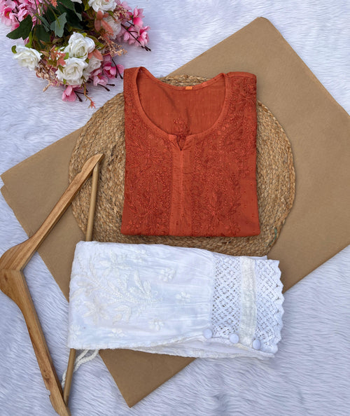 Classy Burnt Orange Summer Breeze Dobby Cotton Short Kurti With Pant