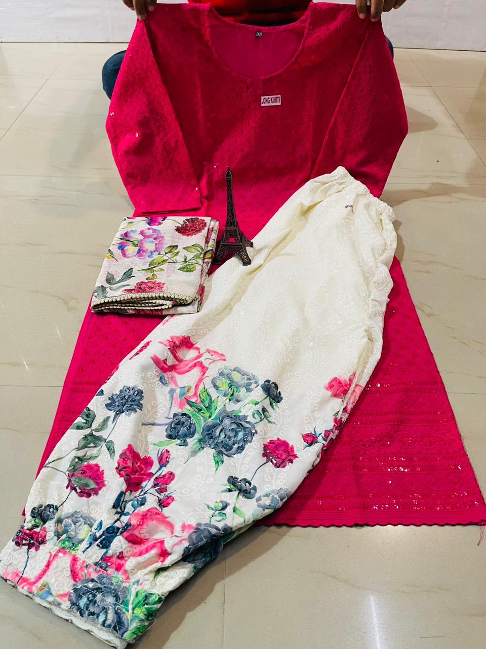 Deep Pink Elegant Ensemble: Ready-to-Wear Chikankari Kurti with Afghani Dupatta Set