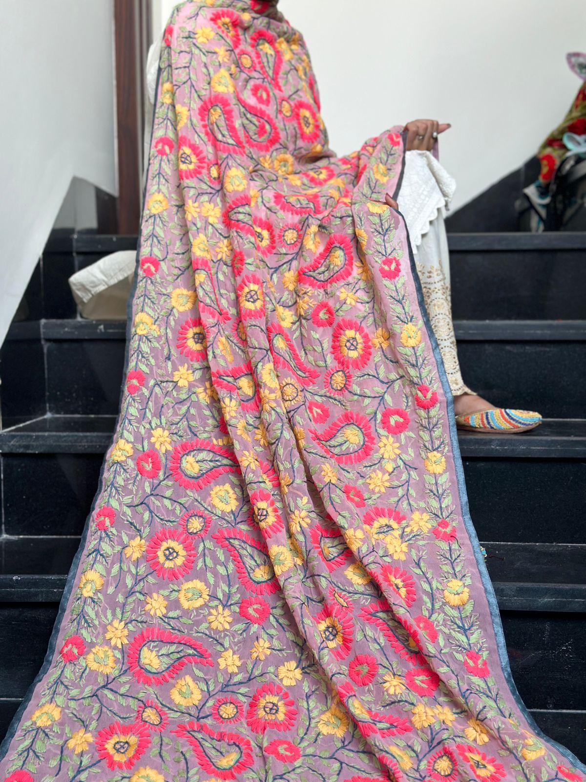 Crafted from luxurious Georgette fabric, our Phulkari Dupatta boasts a length of 2.30 meters and a width of 1.0 meter, offering versatility and grace with every drape.
