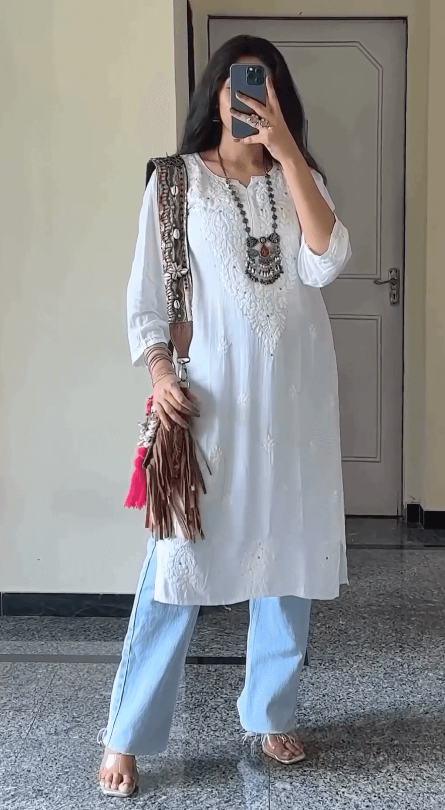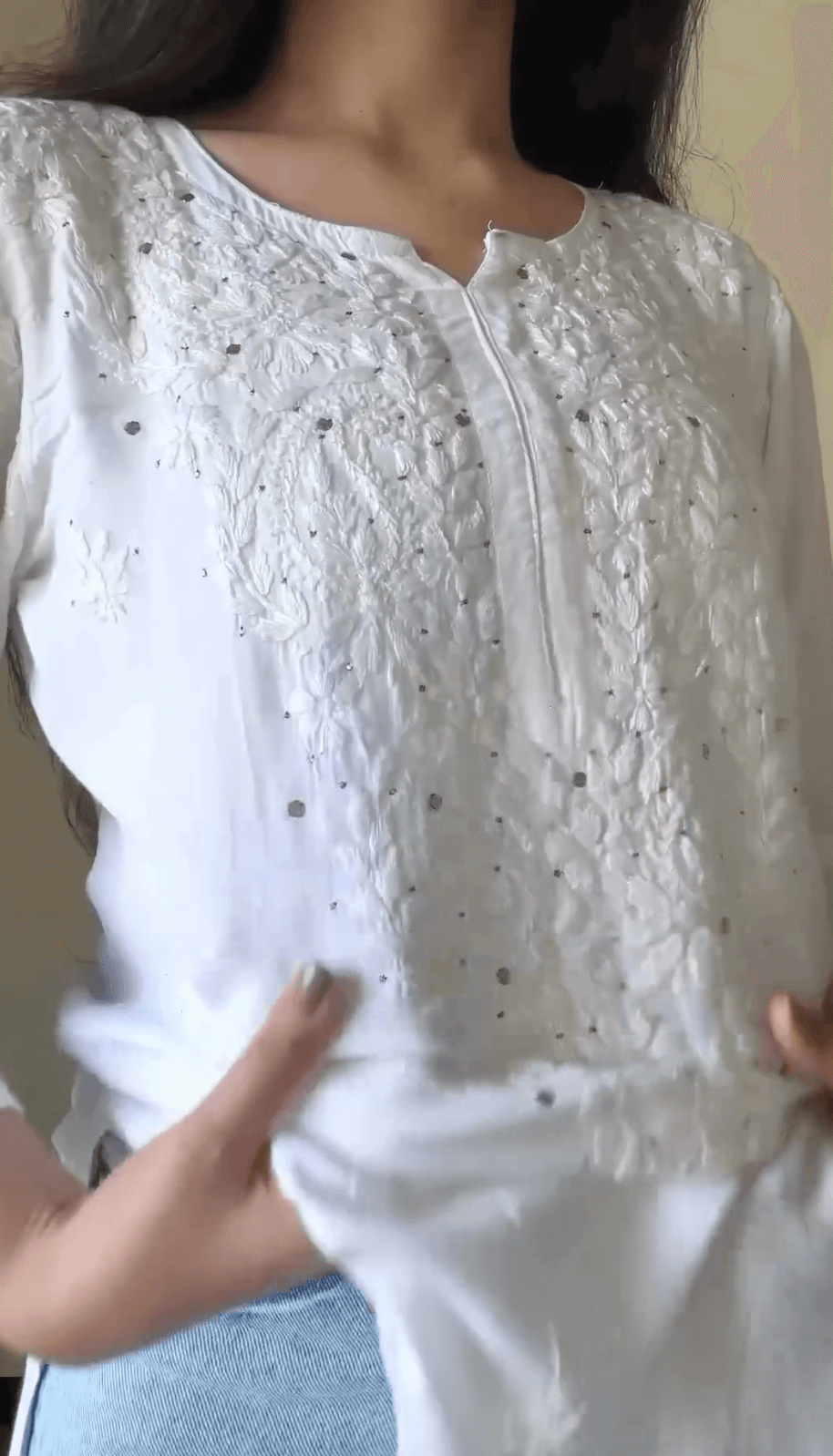 Elegant White Soft Rayon White Tone-on-Tone Chikankari Mukaish Work Kurti Set