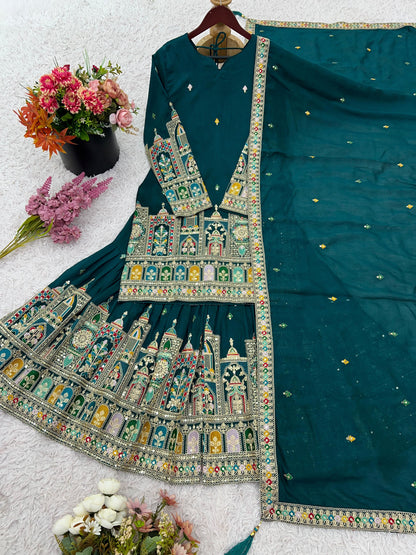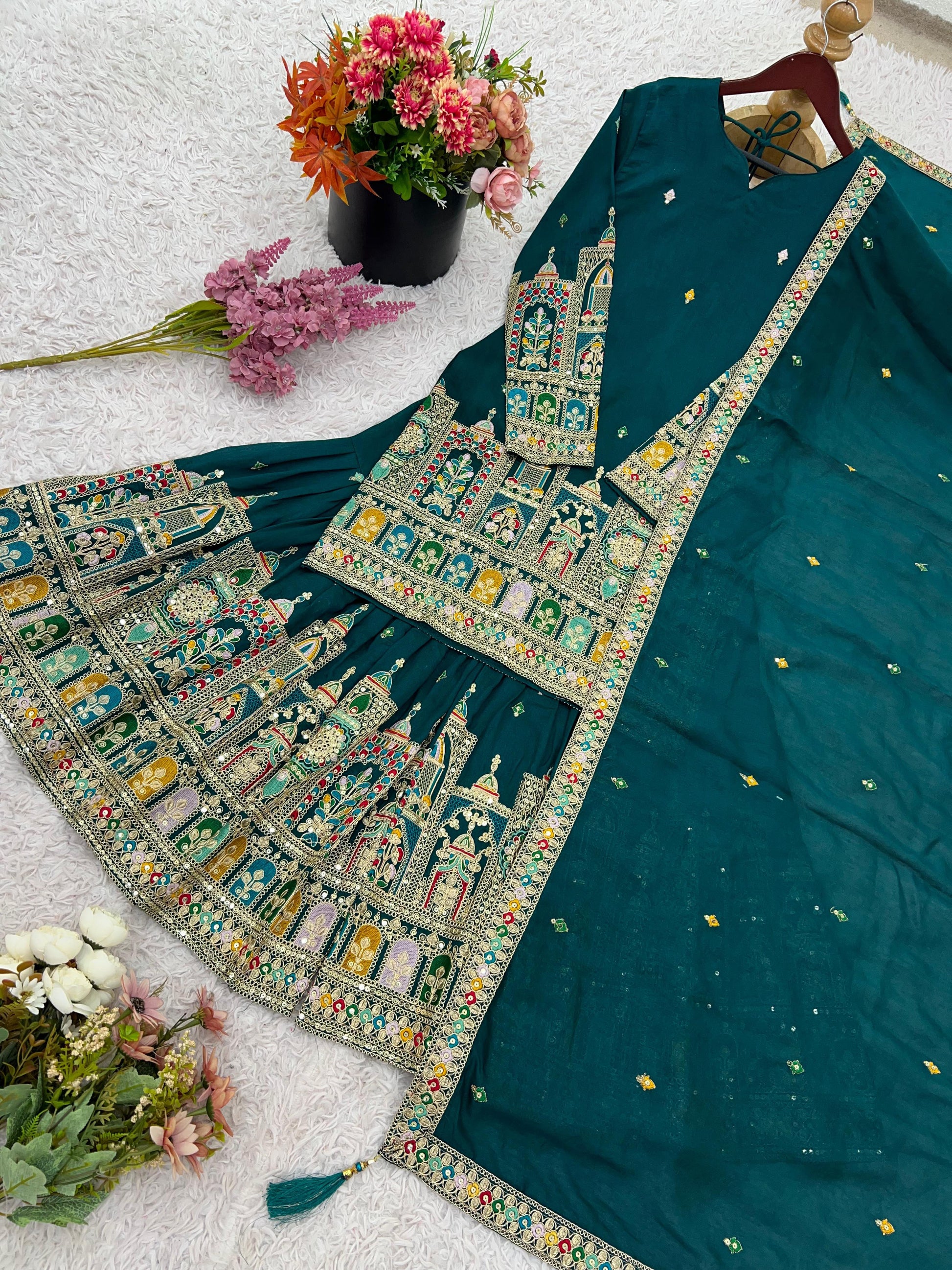 Unveil your inner diva with our new designer collection. This exquisite Designer Salwar Suit is crafted from pure, lustrous Chinon silk, featuring heavy and intricate embroidery with coding dori and shimmering sequence work. From the fully-sleeved top to the flowing palazzo with unique bead detailing on the back, every element of this ready-to-wear ensemble is designed to make you stand out at any wedding, party, or festive occasion.