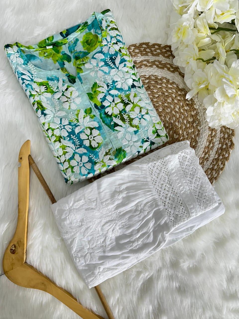 Green Mixed color Mul Mul Daman Elegance: Hand-Embroidered Kurta & Afghani Pant Set