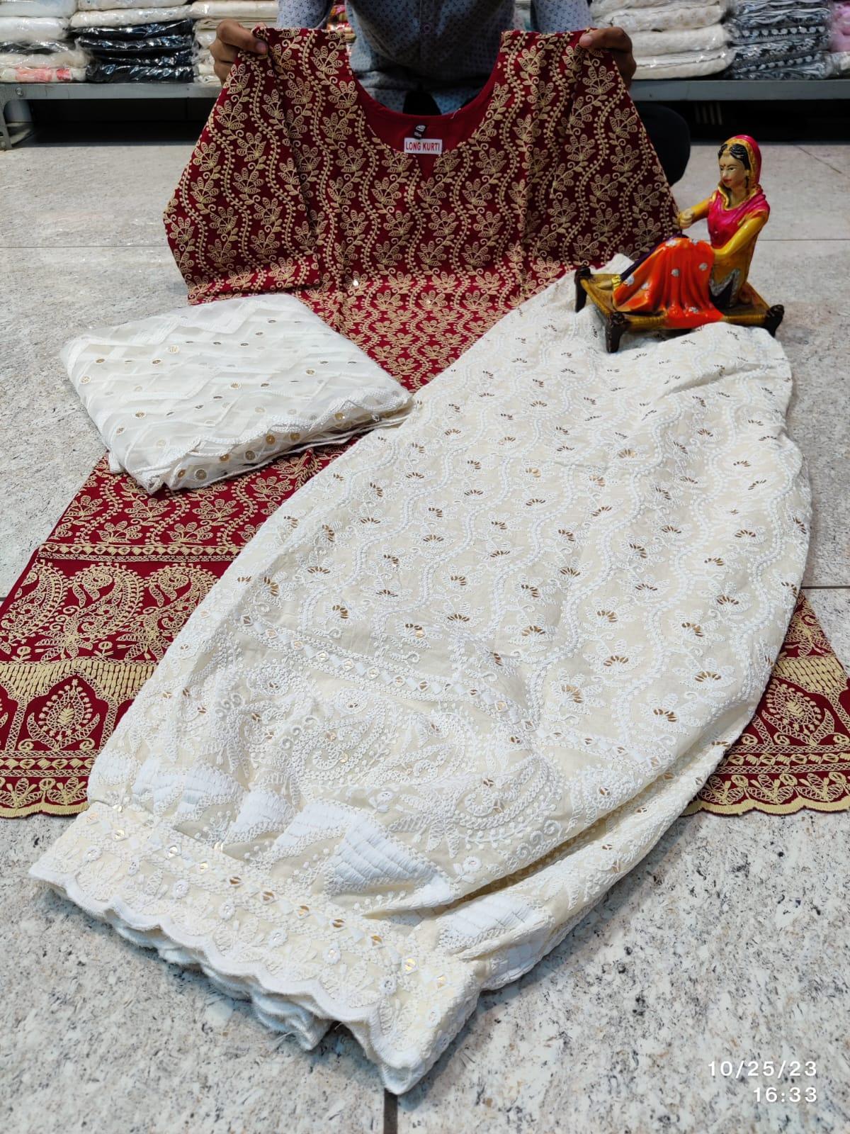 This ensemble features a stunning Chikankari Kurti meticulously crafted on pure cotton fabric, adorned with delicate sequins and intricate embroidery, available in sizes ranging from 38 to 48.