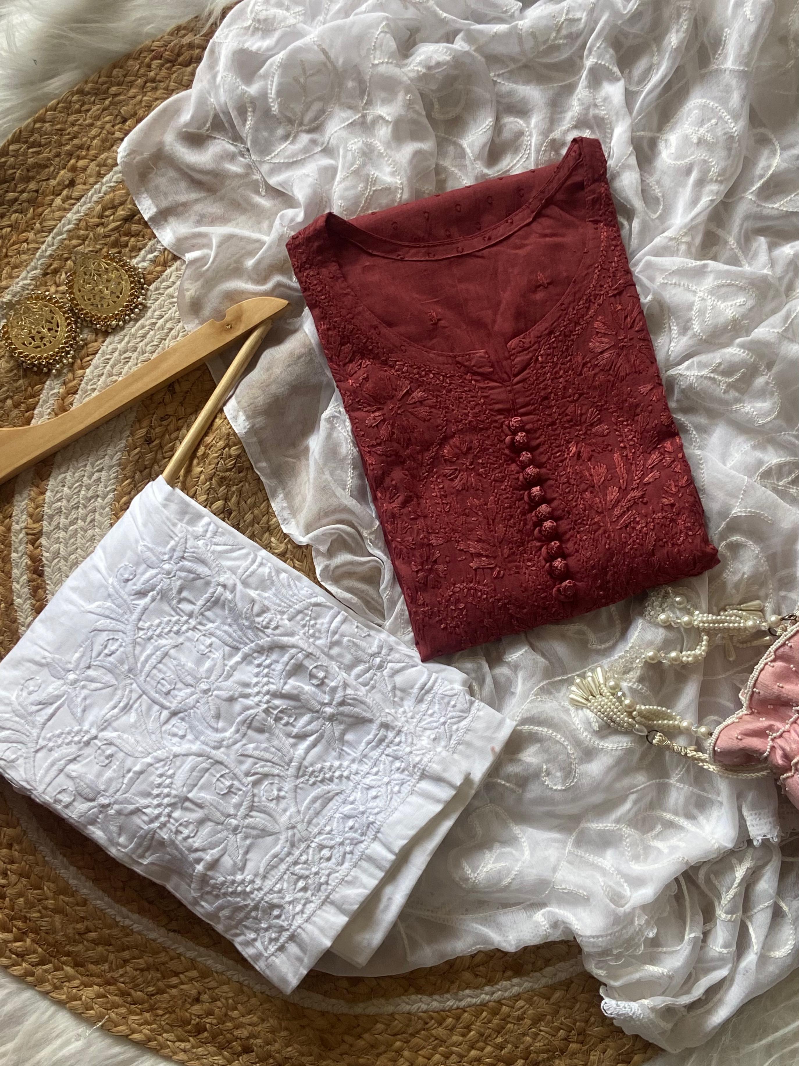 Brown Luxe Cotton Chikankari Dyable Kurti Set with Aari Work Dupatta