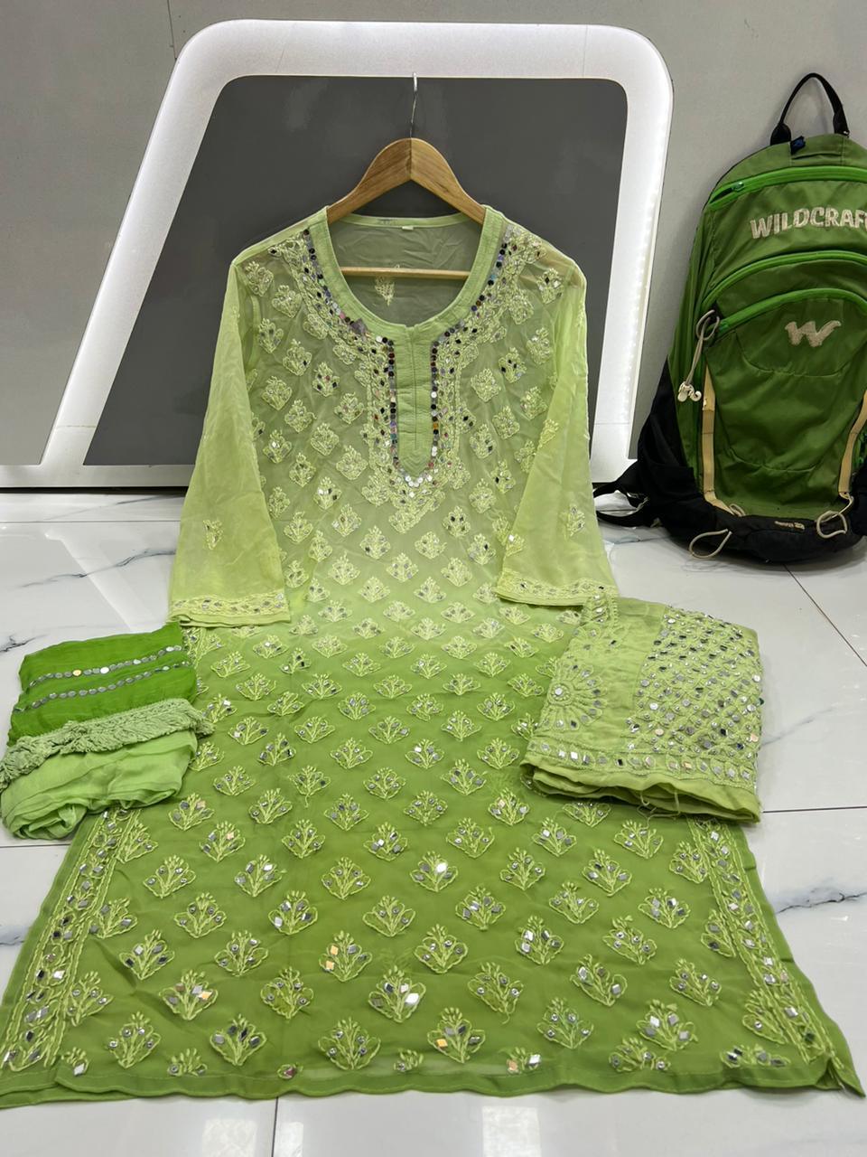 The set includes a beautiful Kurti, a matching Sharara, and a complementary Dupatta, all adorned with a delicate Mirror Booti Jaal design. The ombré effect on the georgette fabric adds a modern twist to the classic Chikankari embroidery, making this set a unique addition to your wardrobe.