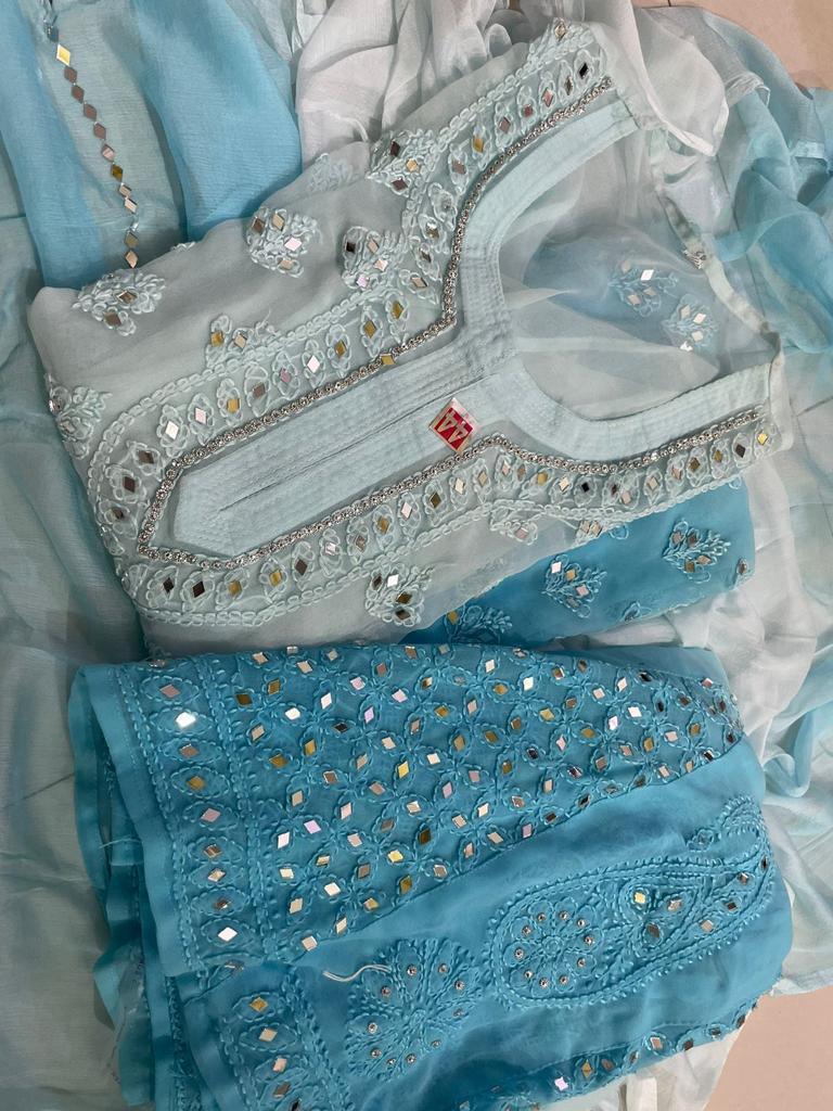 Introducing our stunning Ombre Blue Georgette Kurti with Potli Handmade Buttons & Mirror Booti Jaal - a must-have addition to your ethnic wear collection. Made with high-quality georgette fabric, this kurti is both comfortable and stylish, perfect for any occasion. The kurti features a beautiful ombre blue color that adds a touch of elegance to your look.