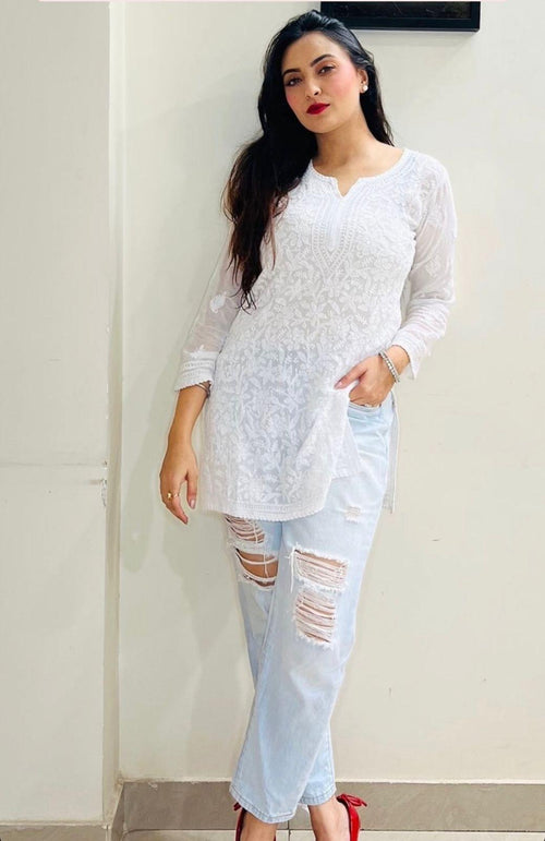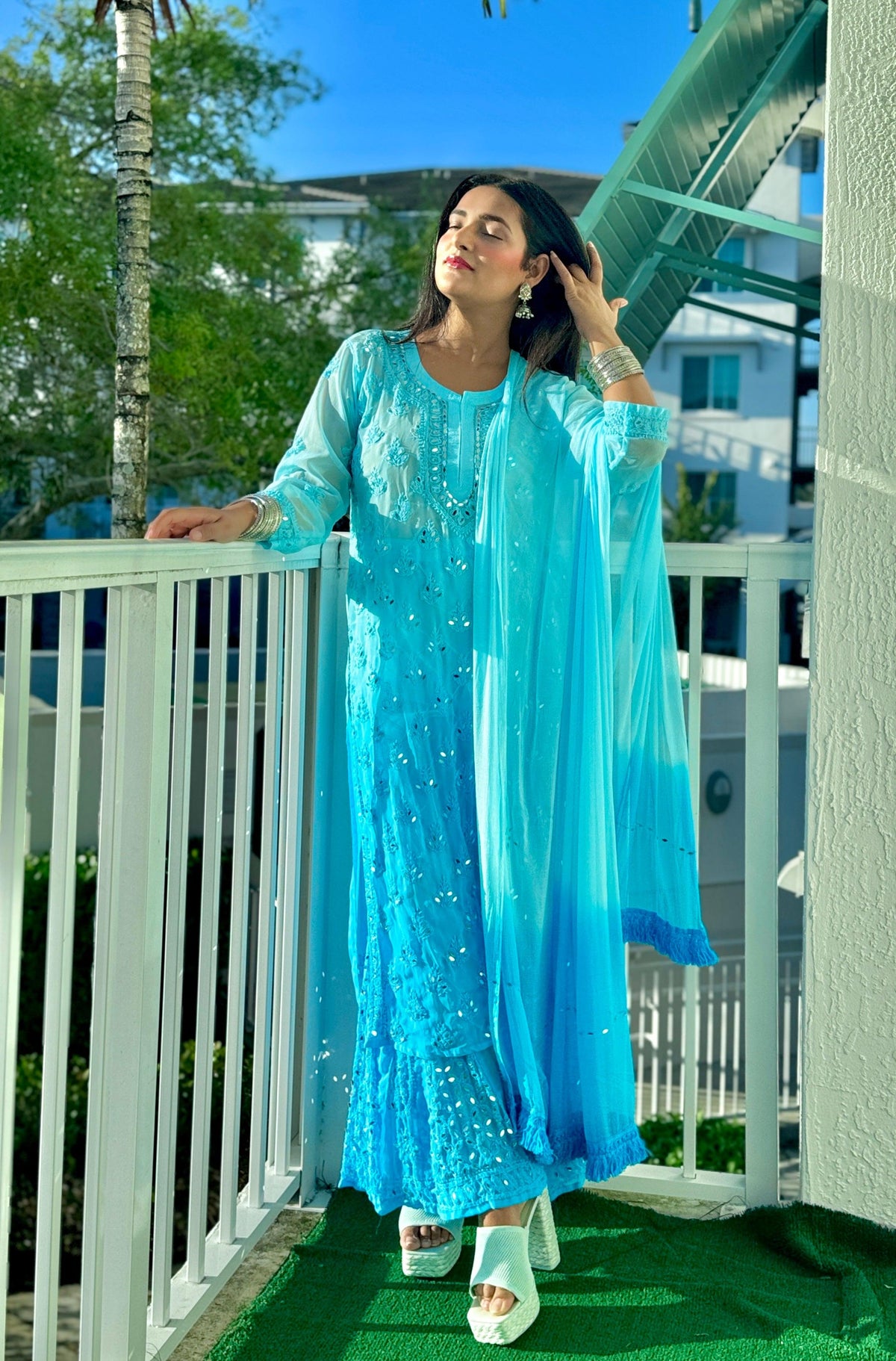 The set includes a beautiful Kurti, a matching Sharara, and a complementary Dupatta, all adorned with a delicate Mirror Booti Jaal design. The ombré effect on the georgette fabric adds a modern twist to the classic Chikankari embroidery, making this set a unique addition to your wardrobe.