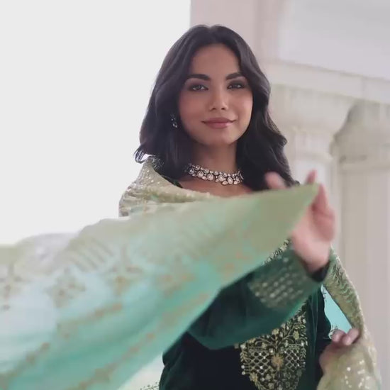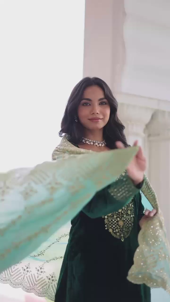 Step into timeless elegance with our Premium Designer Velvet Top-Pant-Dupatta Set, crafted for women who love luxury and festive glamour. This stunning three-piece outfit is made from rich velvet fabric, beautifully adorned with sequins and zari embroidery that adds a royal charm to your look.
