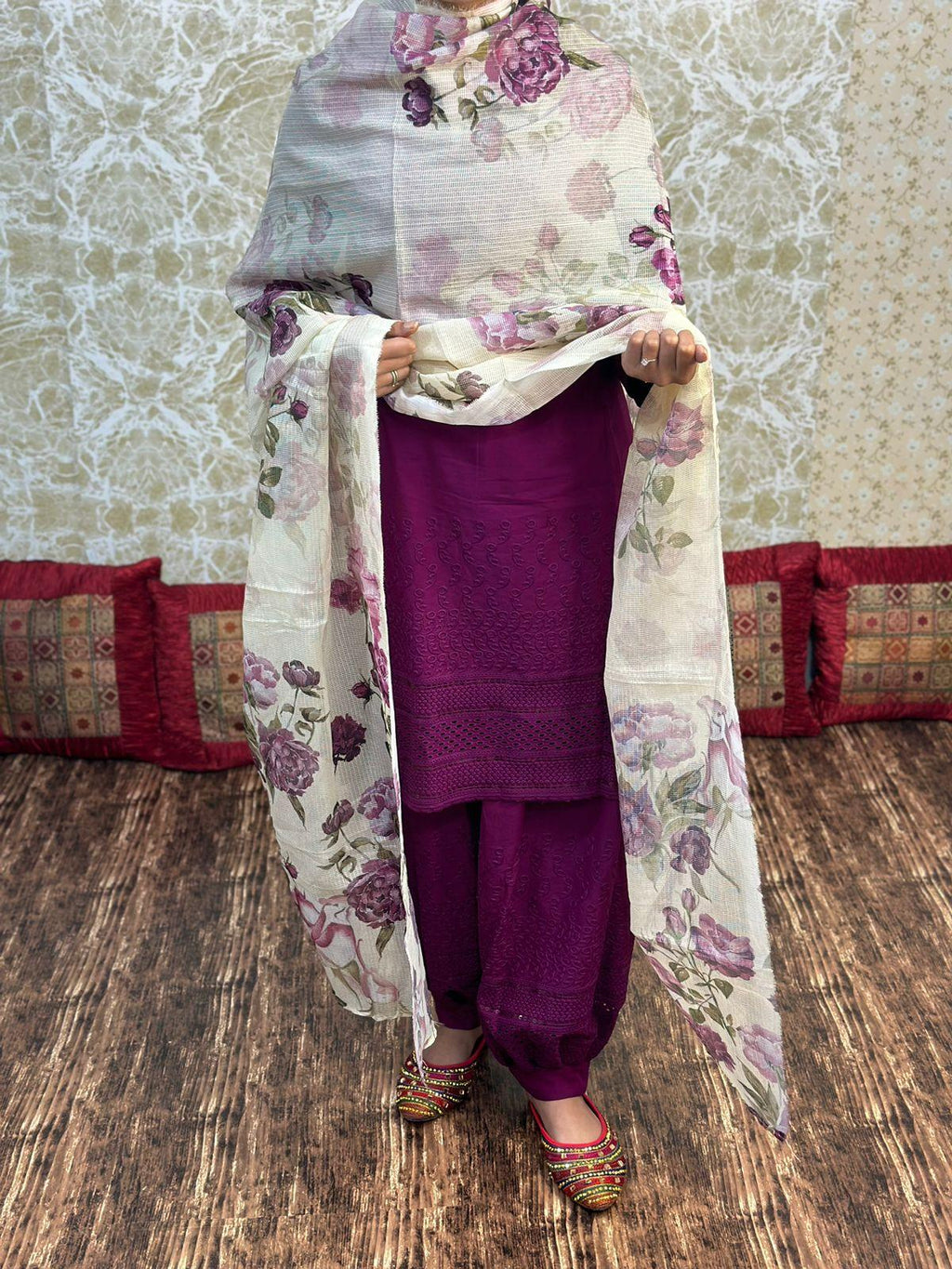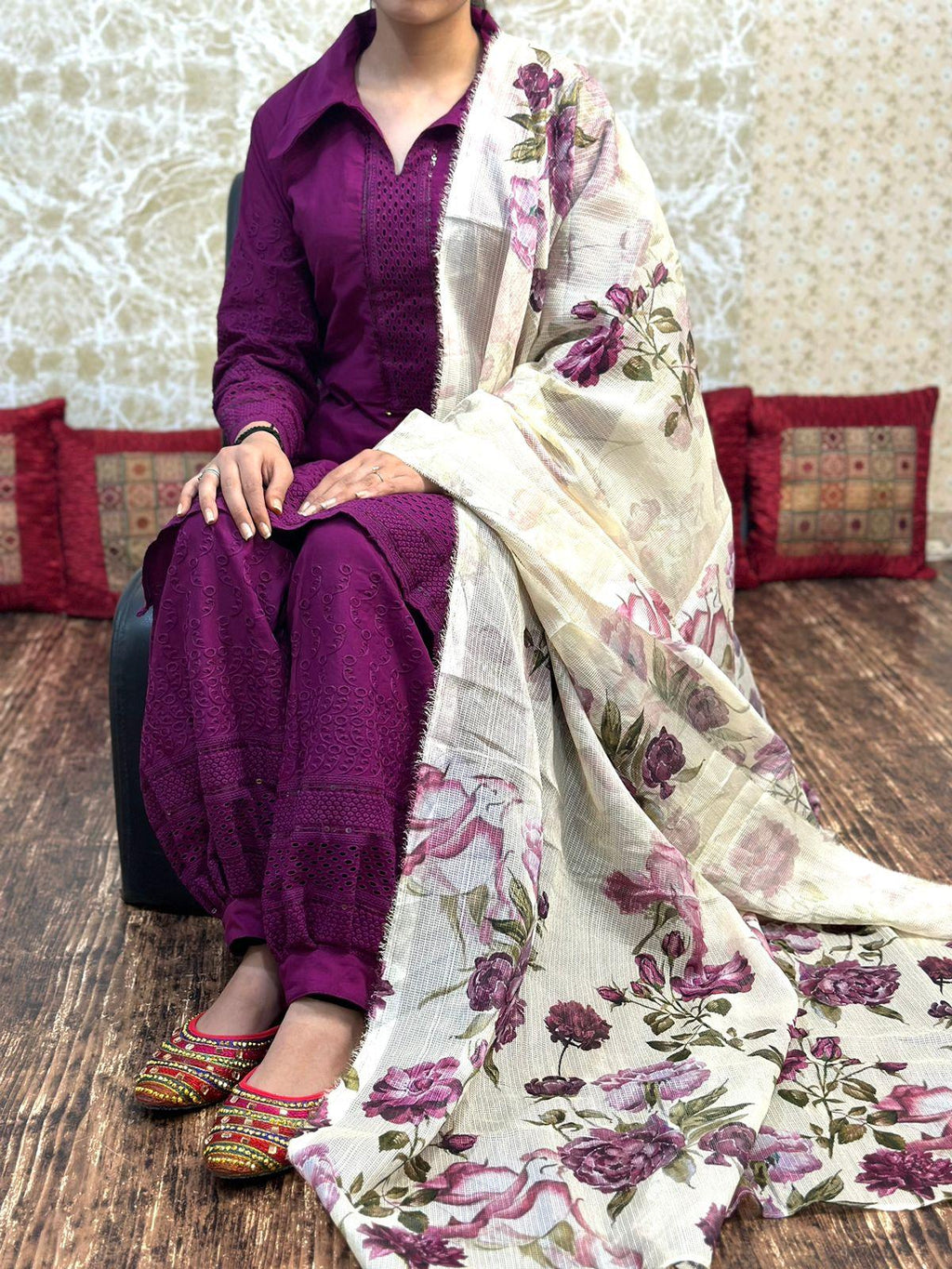 Whether you're looking for something to wear to work, for a casual day out, or for a special occasion, this purple pure cotton Afghani chikan kurta paired with a digital printed dupatta is the perfect choice. Shop online now and add this beautiful set to your wardrobe.