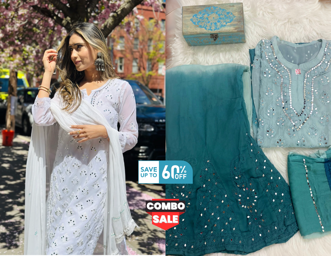 Set of 2 Combo Chikankari Elegance Ombré Mirror Set ( Ombre Green / White )