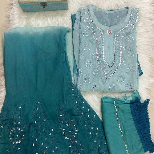 The set includes a beautiful Kurti, a matching Sharara, and a complementary Dupatta, all adorned with a delicate Mirror Booti Jaal design. The ombré effect on the georgette fabric adds a modern twist to the classic Chikankari embroidery, making this set a unique addition to your wardrobe.