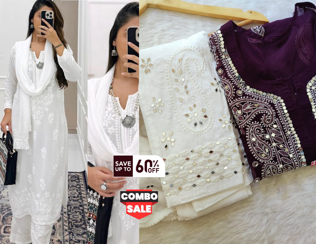 Set of 2 Combo Deep Maroon Chikankari Mirror Set & White Chikankari Modal 3 Pc Set