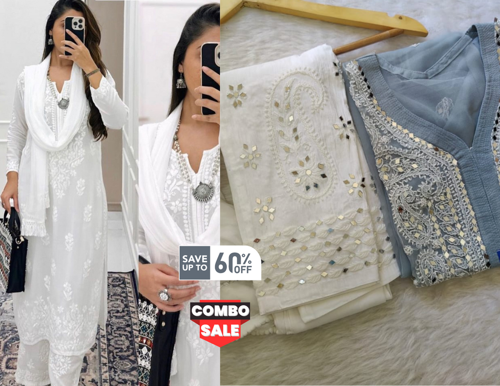 Set of 2 Combo Greyish Blue Chikankari Mirror Set & White Chikankari Modal 3 Pc Set