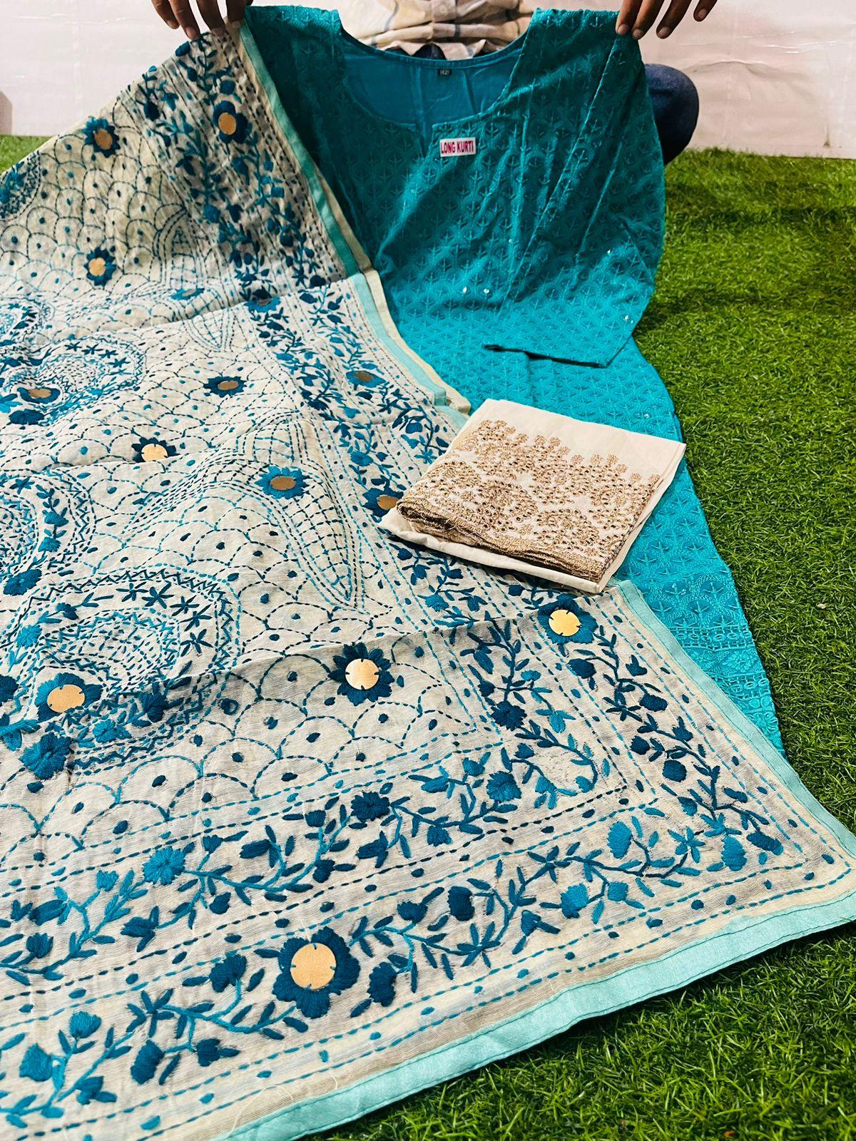 Chikankari Sequence Work Kurti: This set features a Chikankari Sequence Work Kurti crafted from cambric cotton fabric, embellished with delicate sequence work. The kurti's length extends to 42+ inches, available in sizes 38 to 48, ensuring a comfortable and flattering fit for various body types.