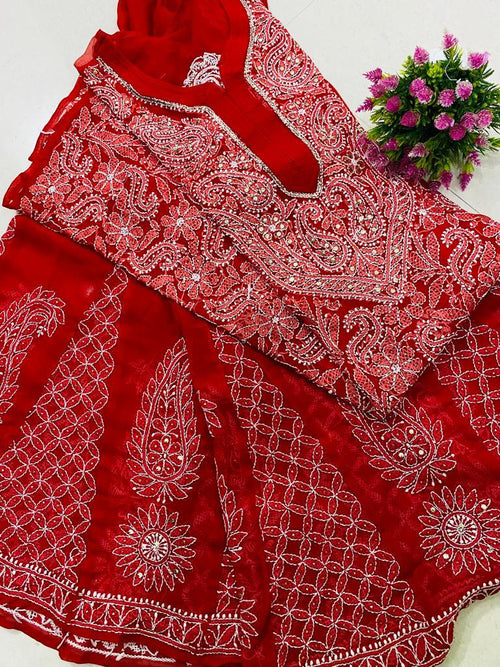 3. Gotta Patti Sharara: Crafted from Pure Georgette and embellished with Handwork Gotta Patti, the Sharara offers a stunning contrast to the Kurti. With a length of 39 inches and a waist that accommodates up to size 46, it provides both style and comfort.