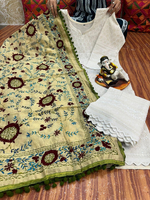 1. Sequins Work Kurti: The heart of this ensemble is the Pure Camric Cotton Kurti adorned with intricate Sequins Work Motifs. With a long length of 43 inches, it drapes gracefully and exudes an aura of sophistication.