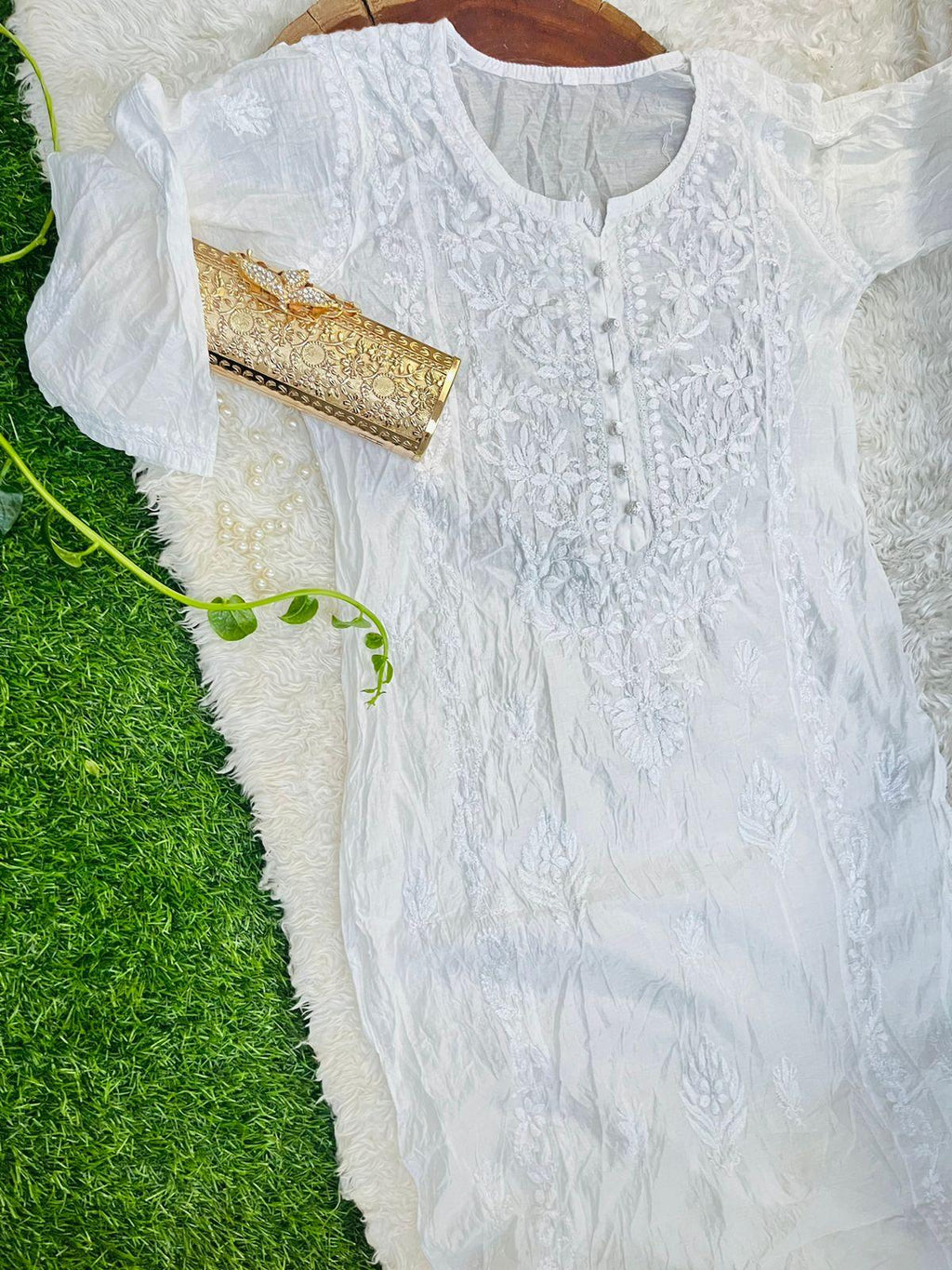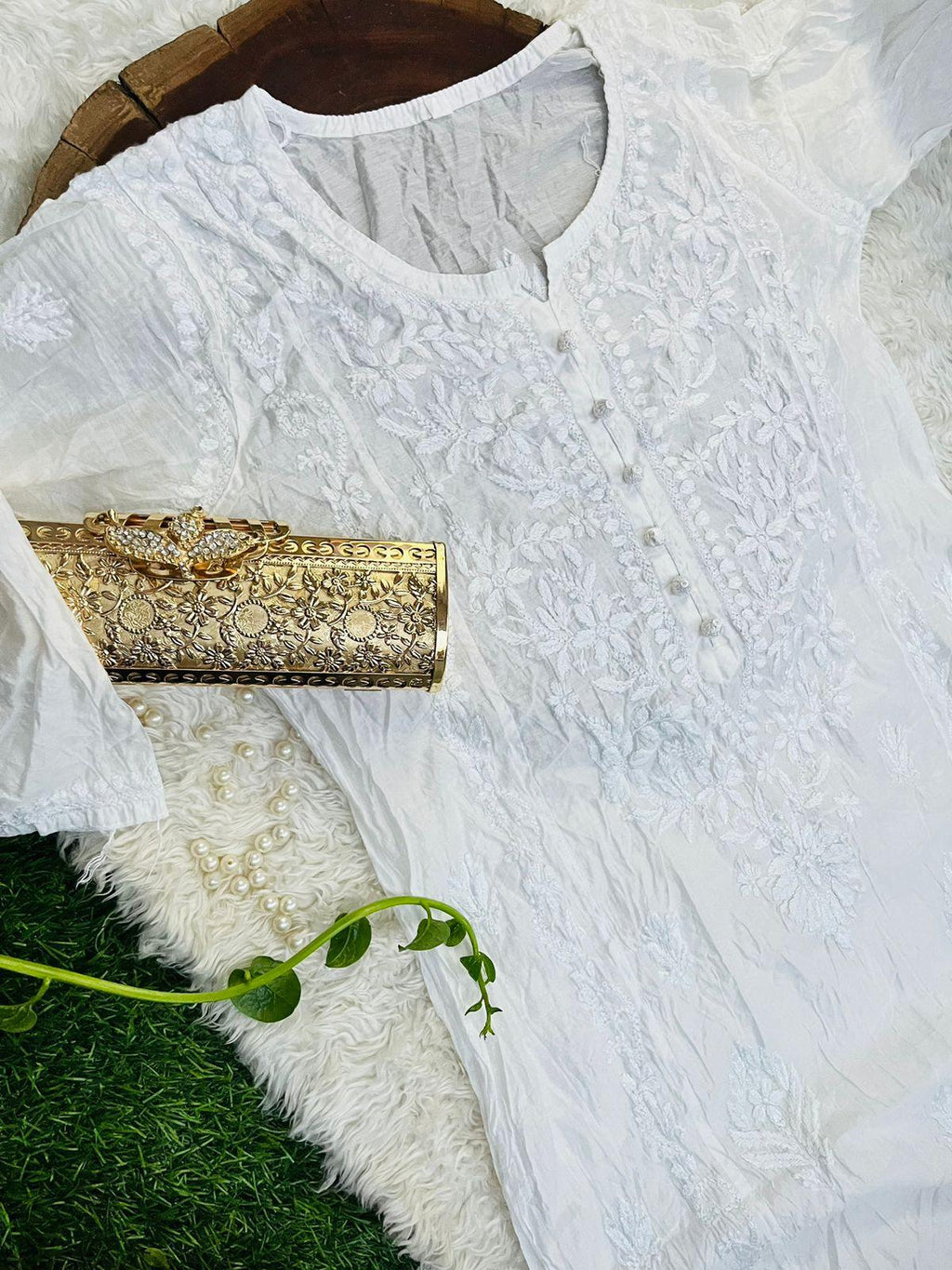 White Chanderi Charm: Dyeable Kalidaar Kurti with Lycra Chikankari Pant