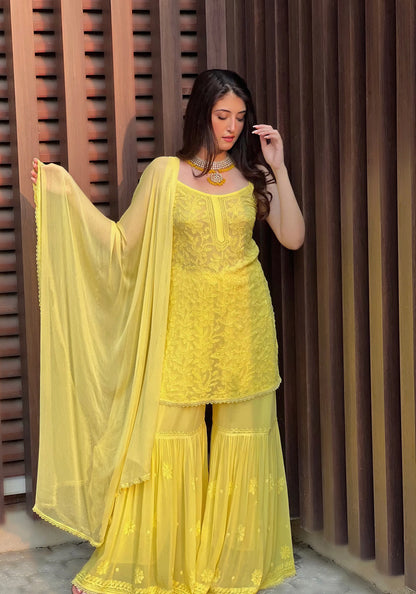 Yellow Handcrafted Lucknow Chikankari Strappy Gharara Set