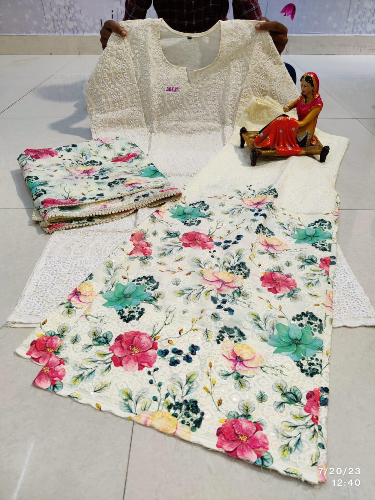 🌸 Enchanting Chikankari Sequins White Kurti Set with Teal Pink Floral Digital Print Sharara and Dupatta🌸