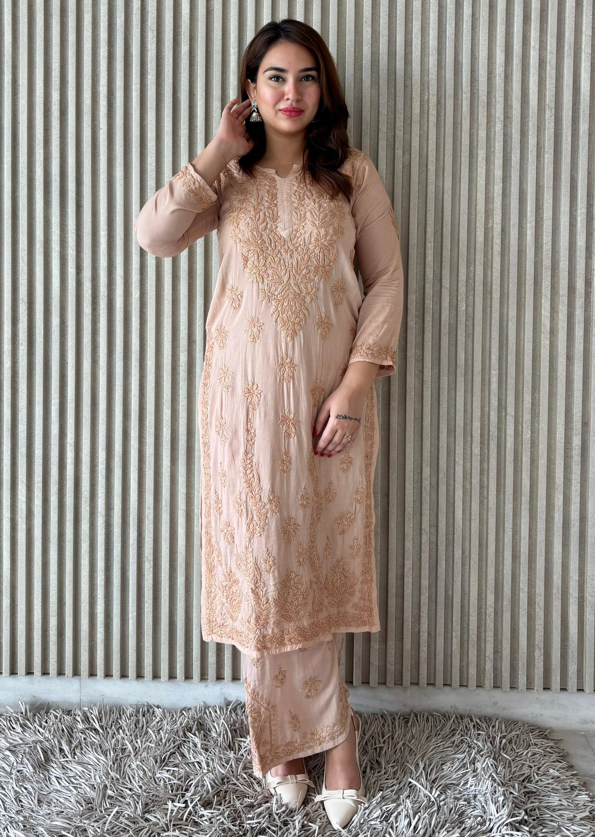 Beige Plus Size Lucknow Chikankari Modal Kurti with Palazzo Set