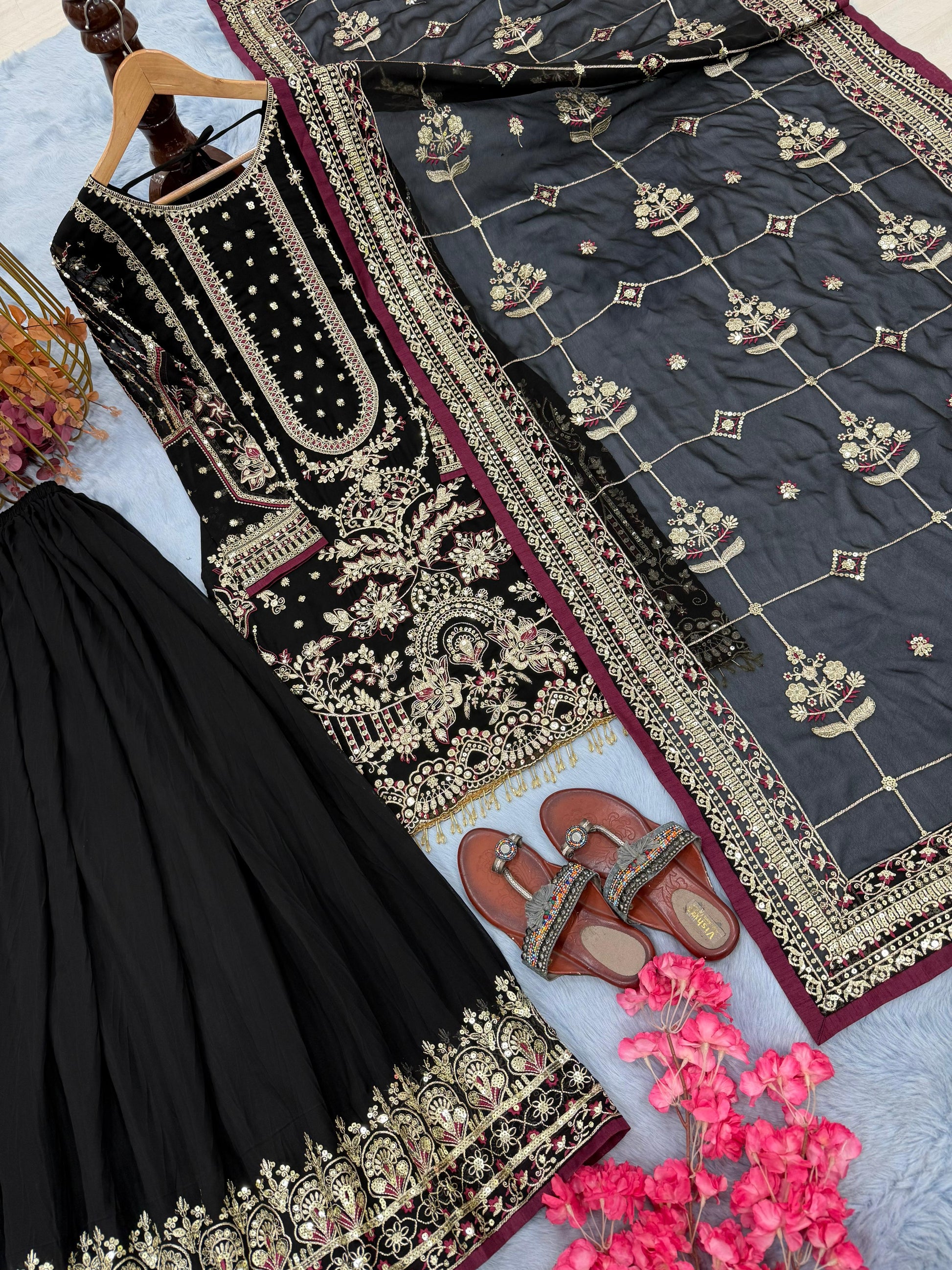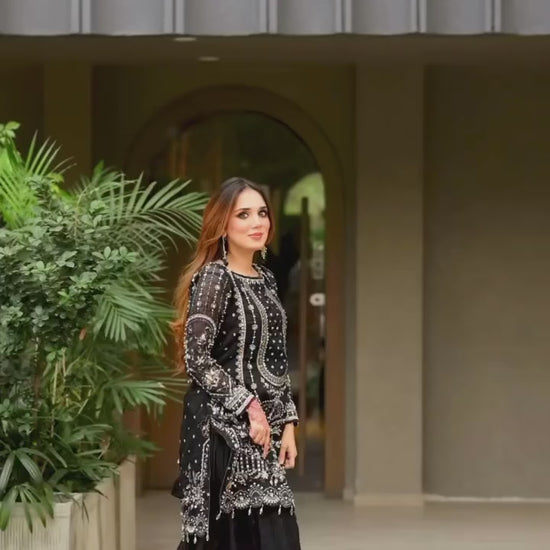 Black Designer Party Wear Heavy Faux Georgette Top, Palazzo Dupatta Set