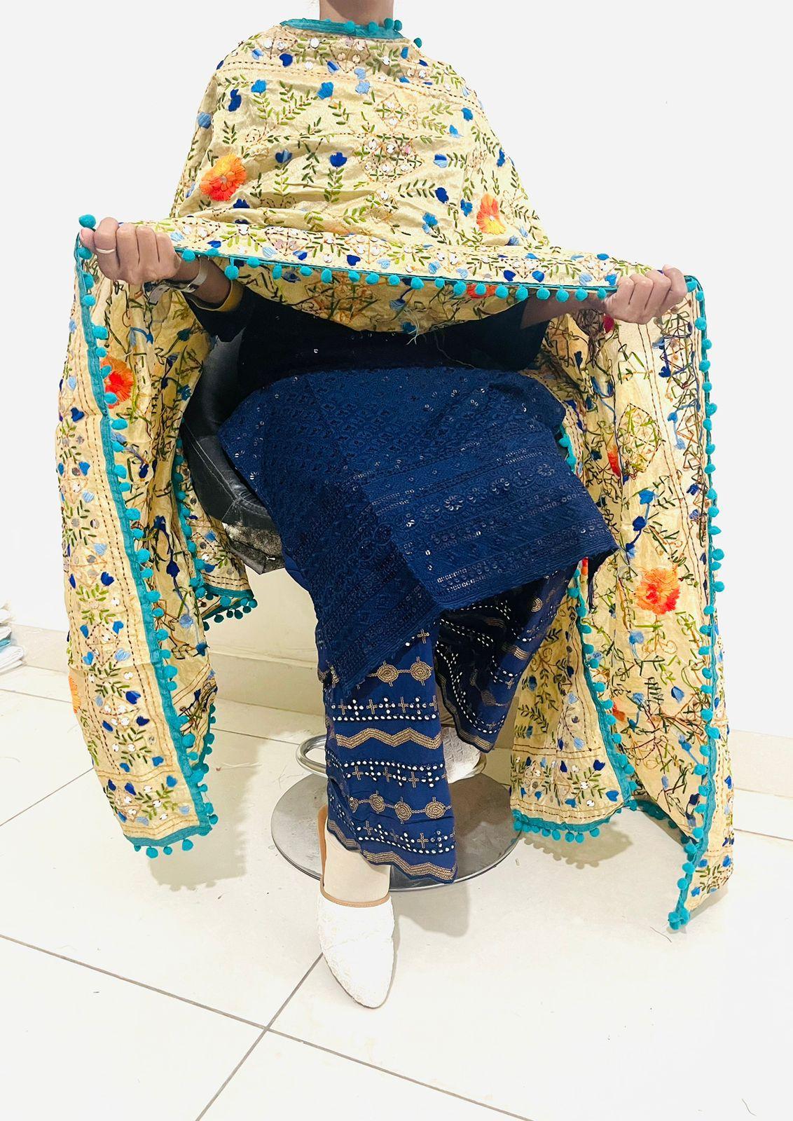 This kurti comes with a luxurious Silk Phulkari Pom Pom Dupatta. The dupatta has intricate phulkari embroidery and fun pom poms, adding a playful touch to your outfit. The rich silk fabric makes it a great choice for festive events or casual outings.
