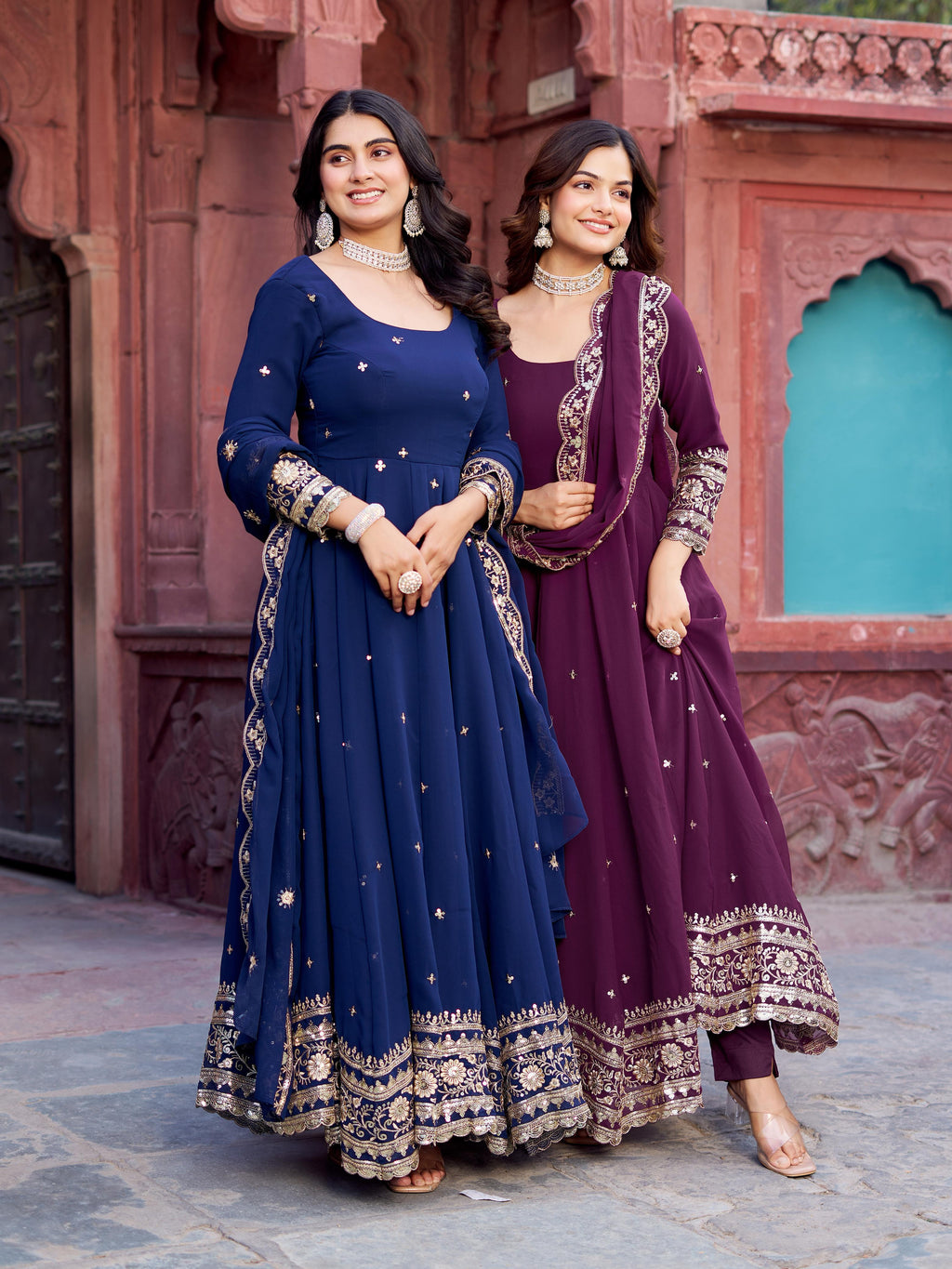 Product Description: Step out in stunning style with our exquisite Faux Georgette Gown set, designed to captivate. This beautiful ensemble features intricate thread and sequin work on both the front and back, ensuring a dazzling look from every angle. The gown is crafted from premium Faux Georgette fabric with a soft Micro inner lining, offering both luxury and comfort.